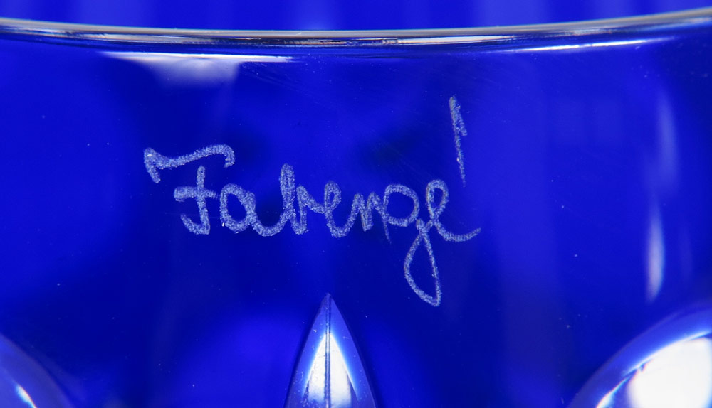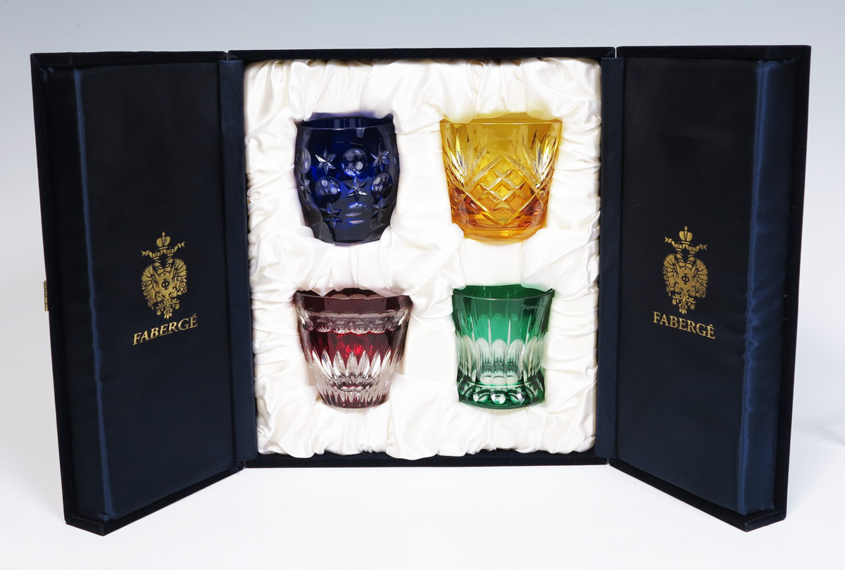 4 CUT TO CLEAR FABERGE TUMBLERS: Each of a different color and shape, with original felt exterior presentation box. Box measures 12'' x 6'' x 10 3/4''.