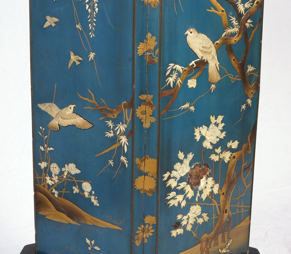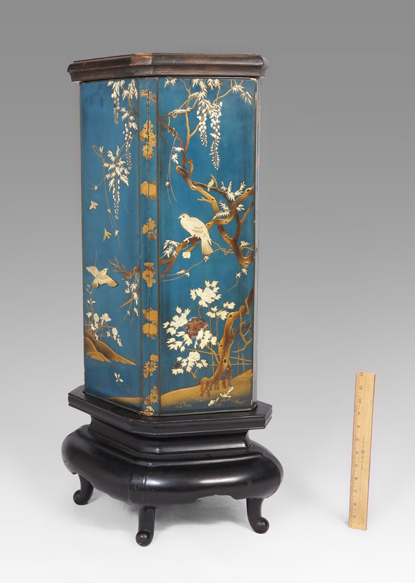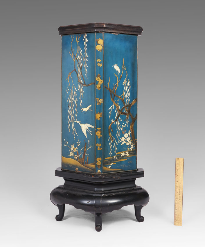 CHINOISERIE WITH MOTHER OF PEARL DECORATED PEDESTAL: Top section with blue lacquer, paint, mother of pearl and enamel decoration. Top opens to reveal open compartment. Removes from carved and shaped base on 4 feet. Overall 35'' h. x 17'' x 12''