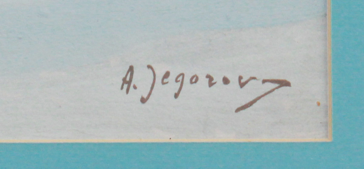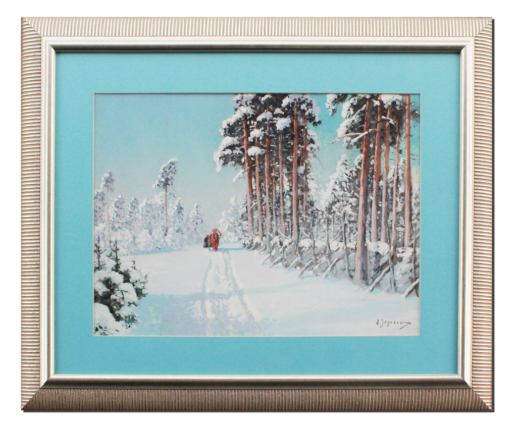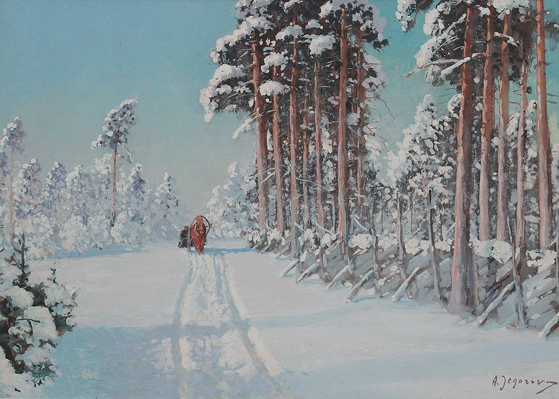 JEGOROV, Andrei, (Russian, 1878-1954): Winter Landscape with Sleigh Through the Forest, Gouache, sight size 13 1/4'' x 18 3/4'', signed lower right, framed, 22 1/2'' x 28''.