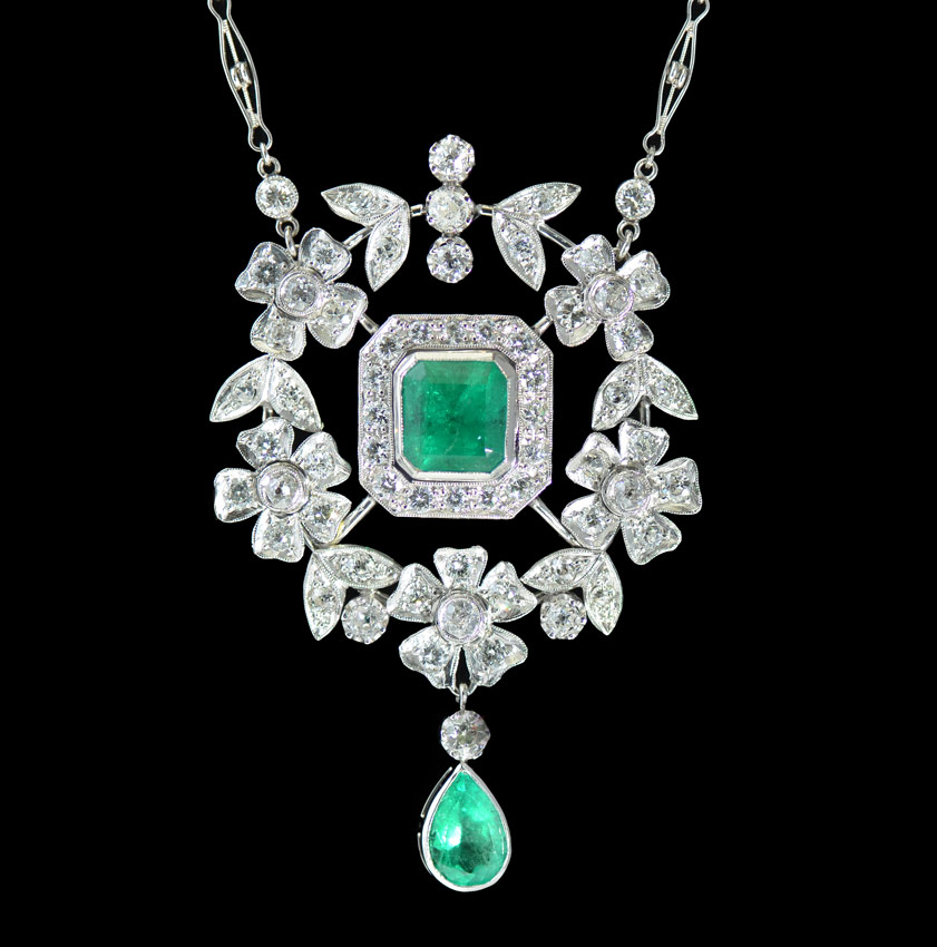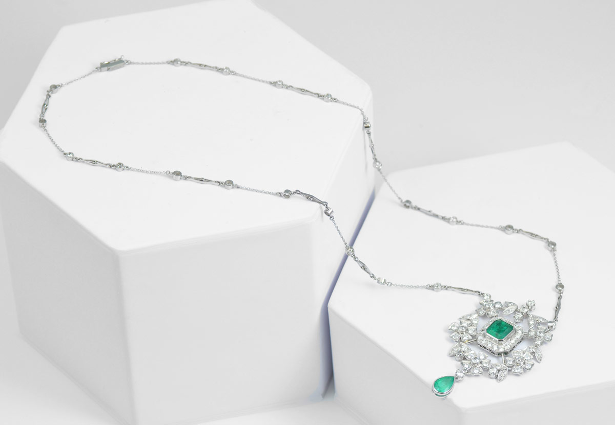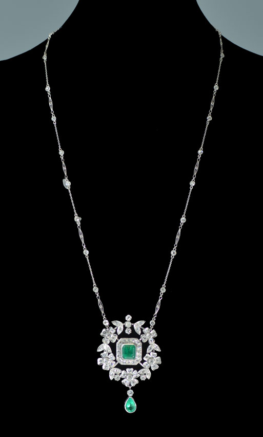 CUSTOM PLATINUM EMERALD & DIAMOND NECKLACE: Take note of the details in this hand crafted work of art. An approx. 2.86 Ct pear shaped emerald is suspended from a floral and leaf open work diamond pendant centering another approx. 2.86 emerald cut emerald. The 20'' chain alternates diamonds, chain, and filigree batons. Total diamond weight is approx. 5.78 ct, they average VS1-SI in clarity and H-I-J color. Diamonds are prong and bezel set, emeralds are bezel set. Weight: 27.4 grams. Signed Dino. Sold with current Florida Diamond Appraisers GIA graduates appraisal for $25,950.