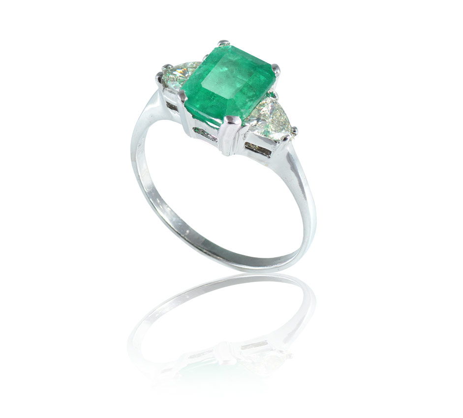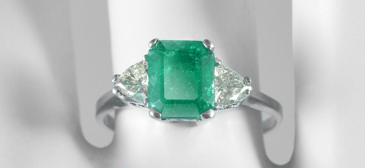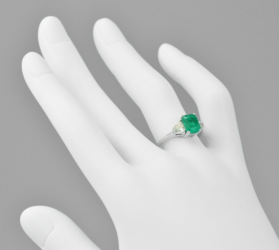 2 CT COLUMBIAN EMERALD RING WITH DIAMONDS: 18K white gold ring centers an approx. 2 Ct emerald cut emerald of VS2 clarity, very strong green G hue, 5 tone and 5 saturation. Flanked by two triangle brilliant cut diamonds totaling approx. .60 Ct., averaging VS1-VS2 in clarity and L-M in color. Stones are prong set. Size 7. Weight 3.5 grams. Sold with current Atlanta Gemological GIA graduates appraisal for $6,350.