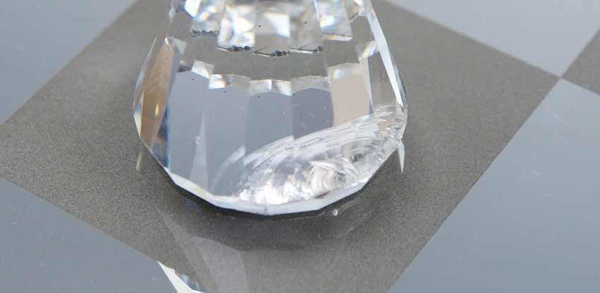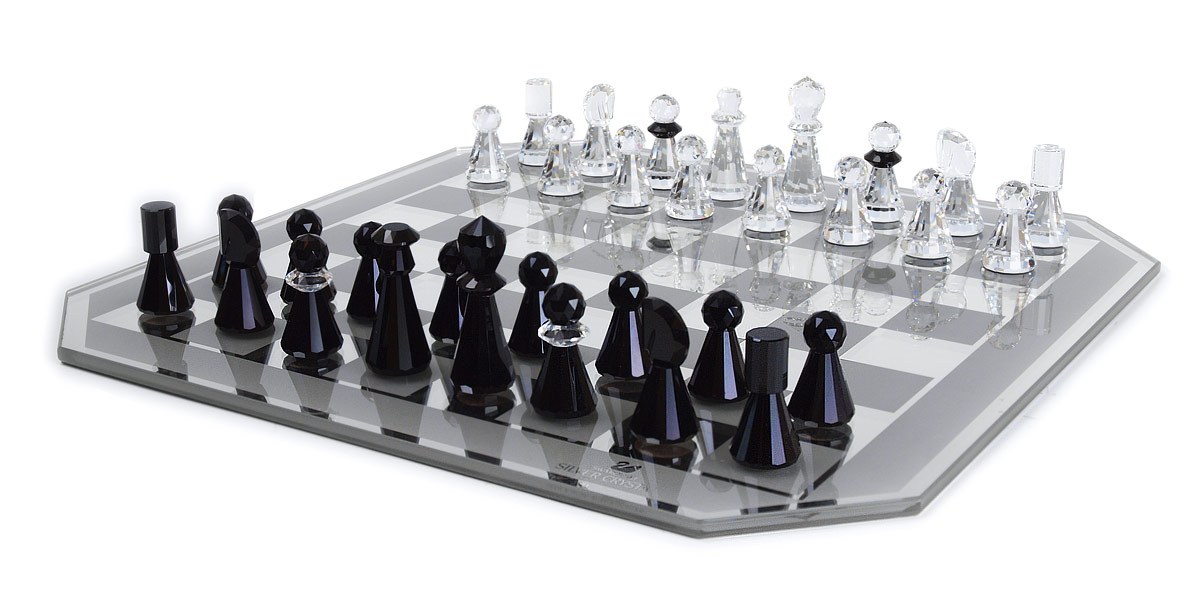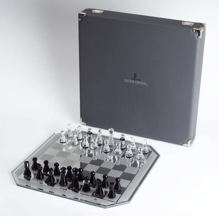 SWAROVSKI CRYSTAL CHESS SET: Crystal pieces & board designed by Max Schreck, grey leatherette carrying case designed by Team, sold with box. Overall 15'' x 15 1/2'' x 3''.