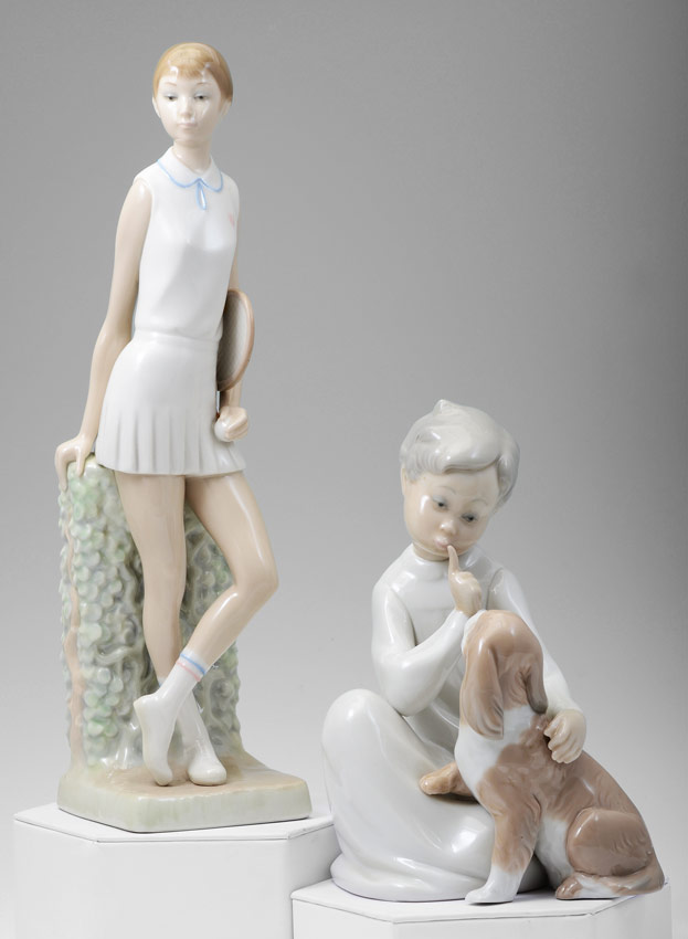 2 LLADRO PORCELAIN FIGURINES BY VINCENTE MARTINEZ: 1) TENNIS PLAYER GIRL, #4798, issued 1972 retired 1981, 12 1/2''h. 2) BOY WITH DOG, #4522, issued 1970 retired 1997, 7 1/2'' x 5''.