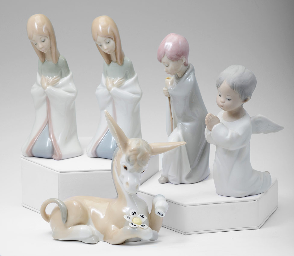 5 LLADRO PORCELAIN FIGURINES: 1) DONKEY IN LOVE, #4524, Fulgencio Garcia designer, issued 1969 retired 1985, 5'' x 5 1/2''; 2) SAINT JOSEPH, #4672, Juan Huerta designer, issued 1969 retired 2001, 6 1/8''h.; 3-4) MARY, #4671, Juan Huerta designer, issued 1969 retired 2001, approx. 6''h. each; 5) ANGEL PRAYING, #4538, Fulgencio Garcia designer, issued 1969 retired 2004, matte finish, 5''h. Sold as a lot.