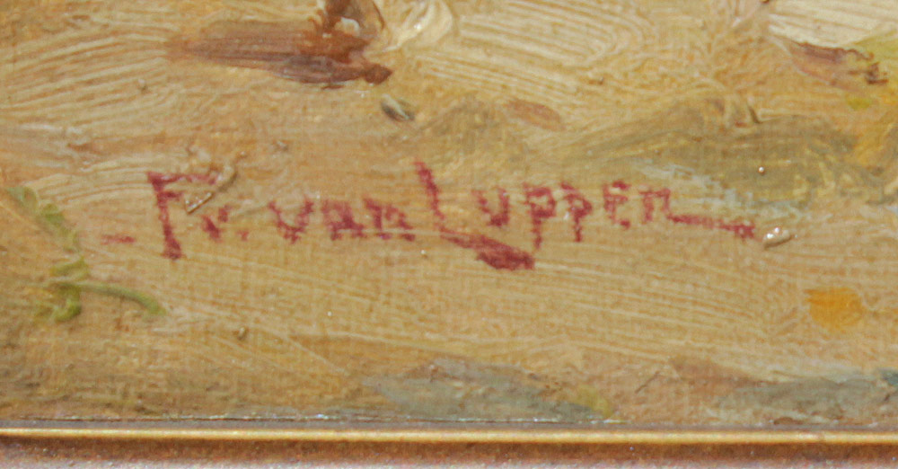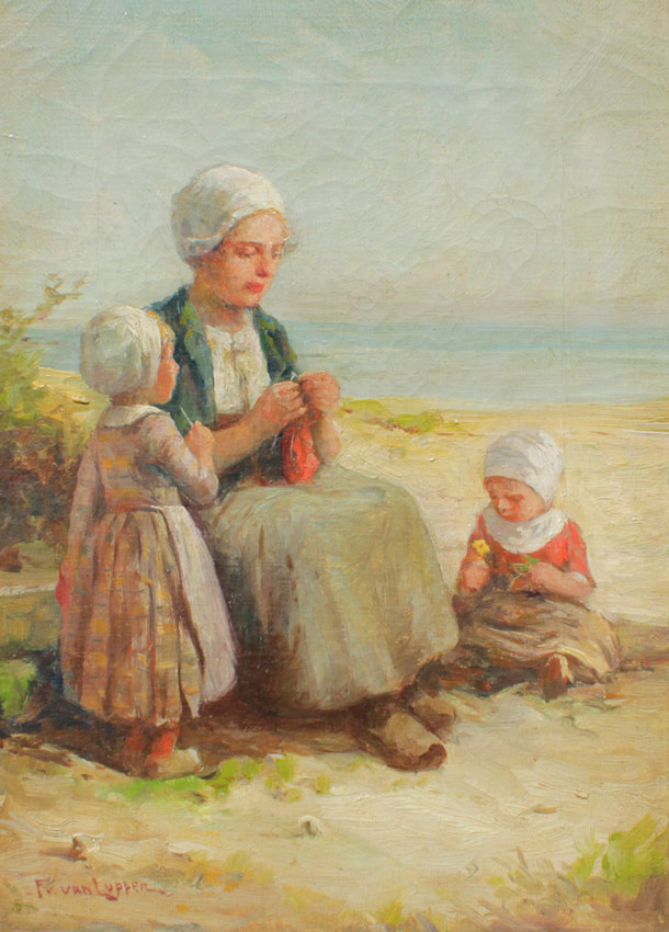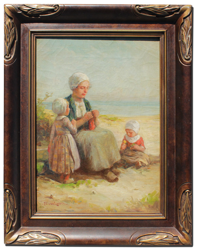 LUPPEN, F. Van, (Dutch, 19th/20th C.): Dutch Mother Knitting on the Beach, with Children Playing, Oil/Canvas, 14'' x 10'', signed lower left, carved and gilded frame, 19'' x 14 3/4''.