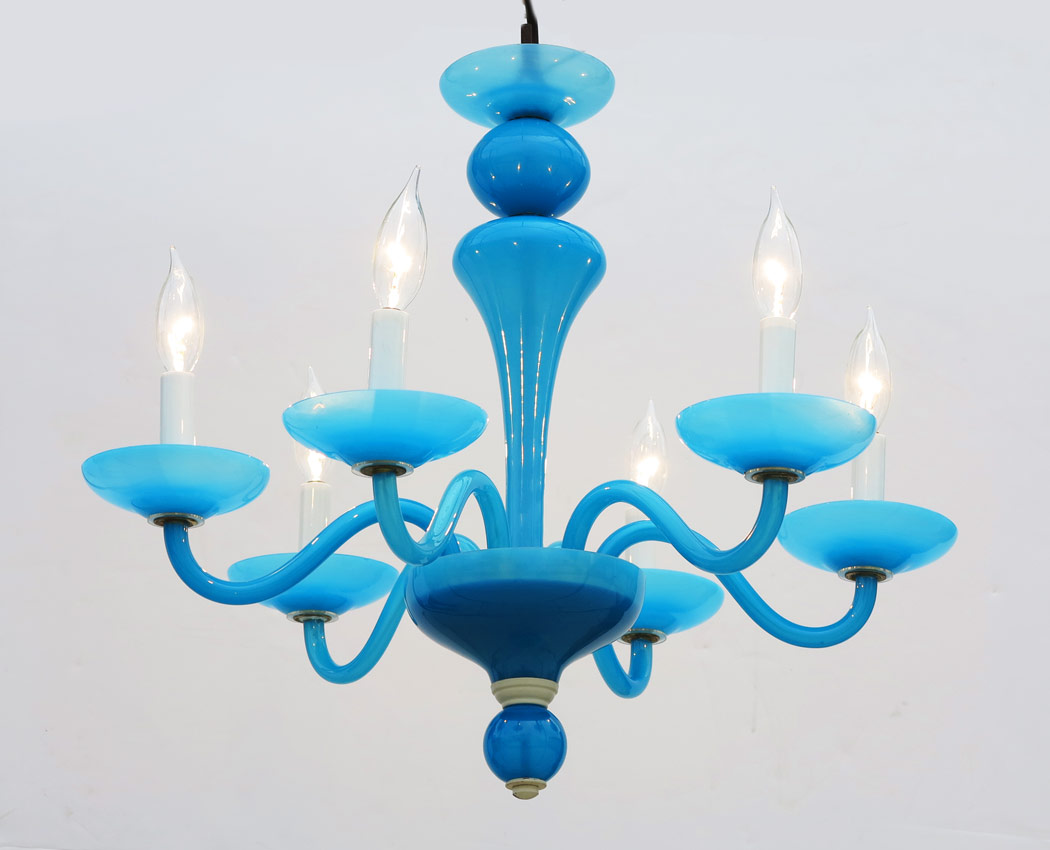 A PETITE BLUE MURANO GLASS CHANDELIER: 6 curved arms, measures approx. 19'' h x 21 3/4'' dia.