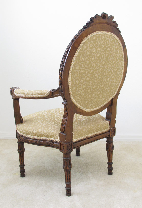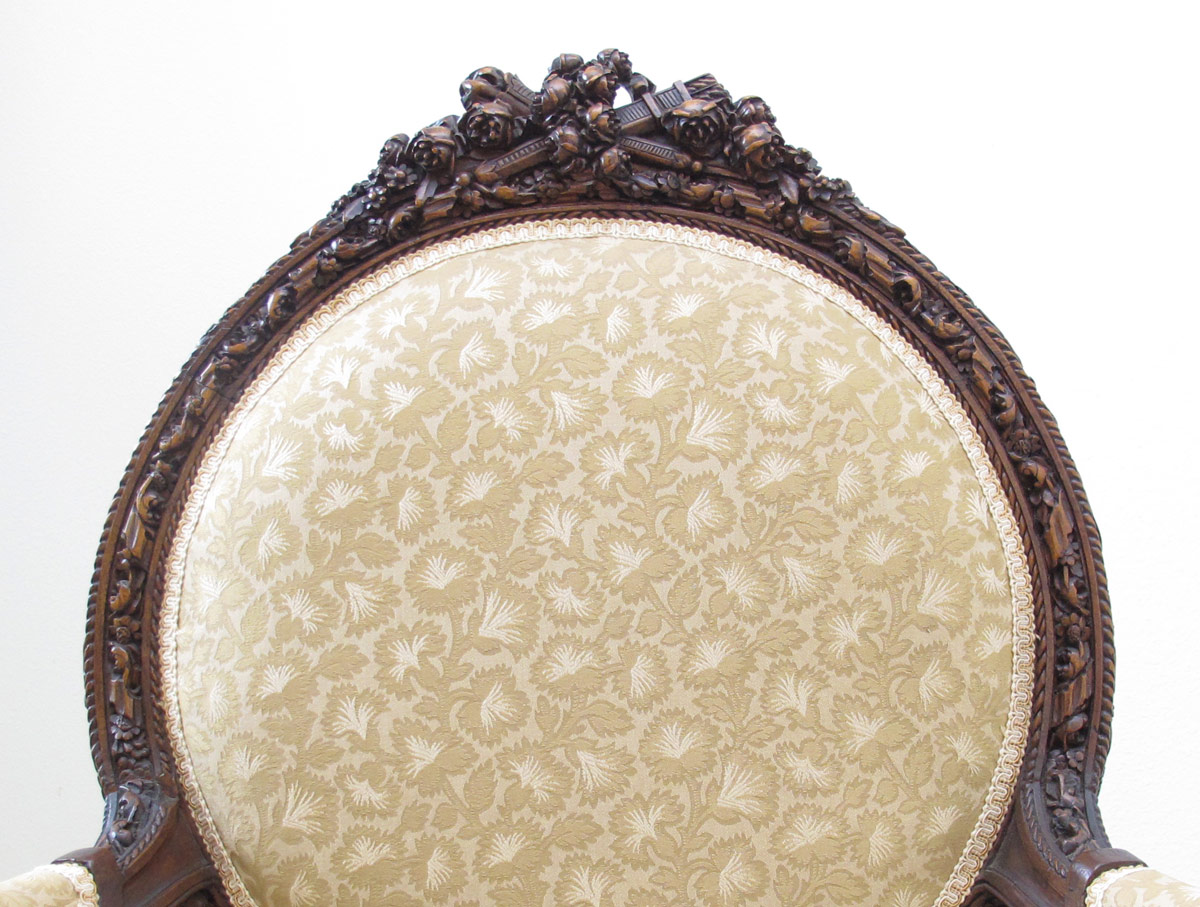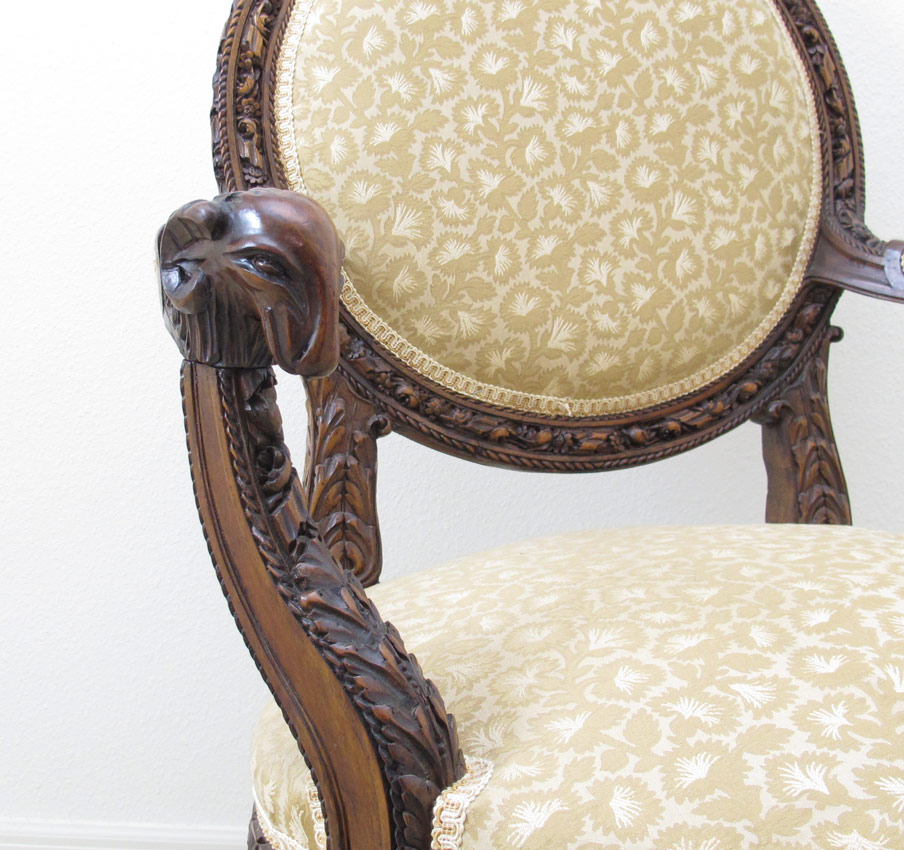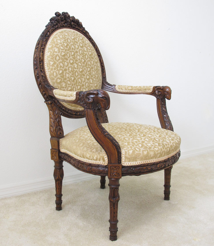 LOUIS XVI CARVED RAMS HEAD CHAIR: Heavily carved with crossed torches, foliate motifs and rams head hand holds. Carved and turned legs, floral upholstery. 42 1/4'' h. x 28'' x 25 1/2''.