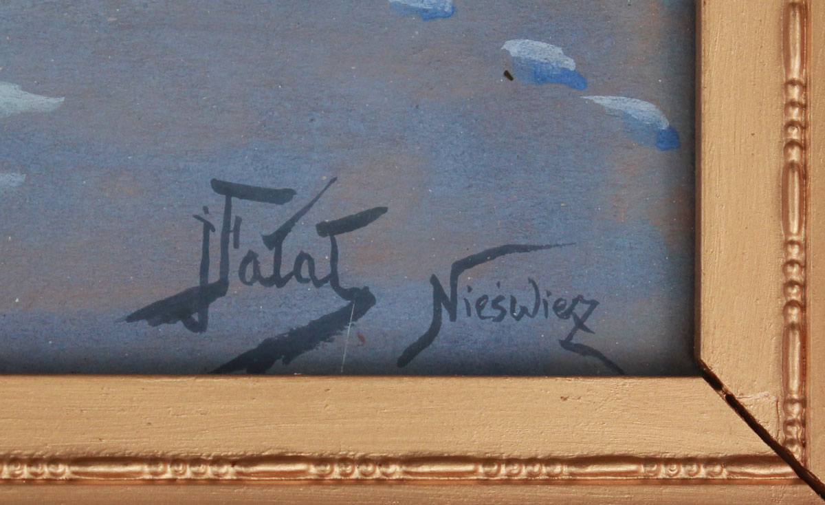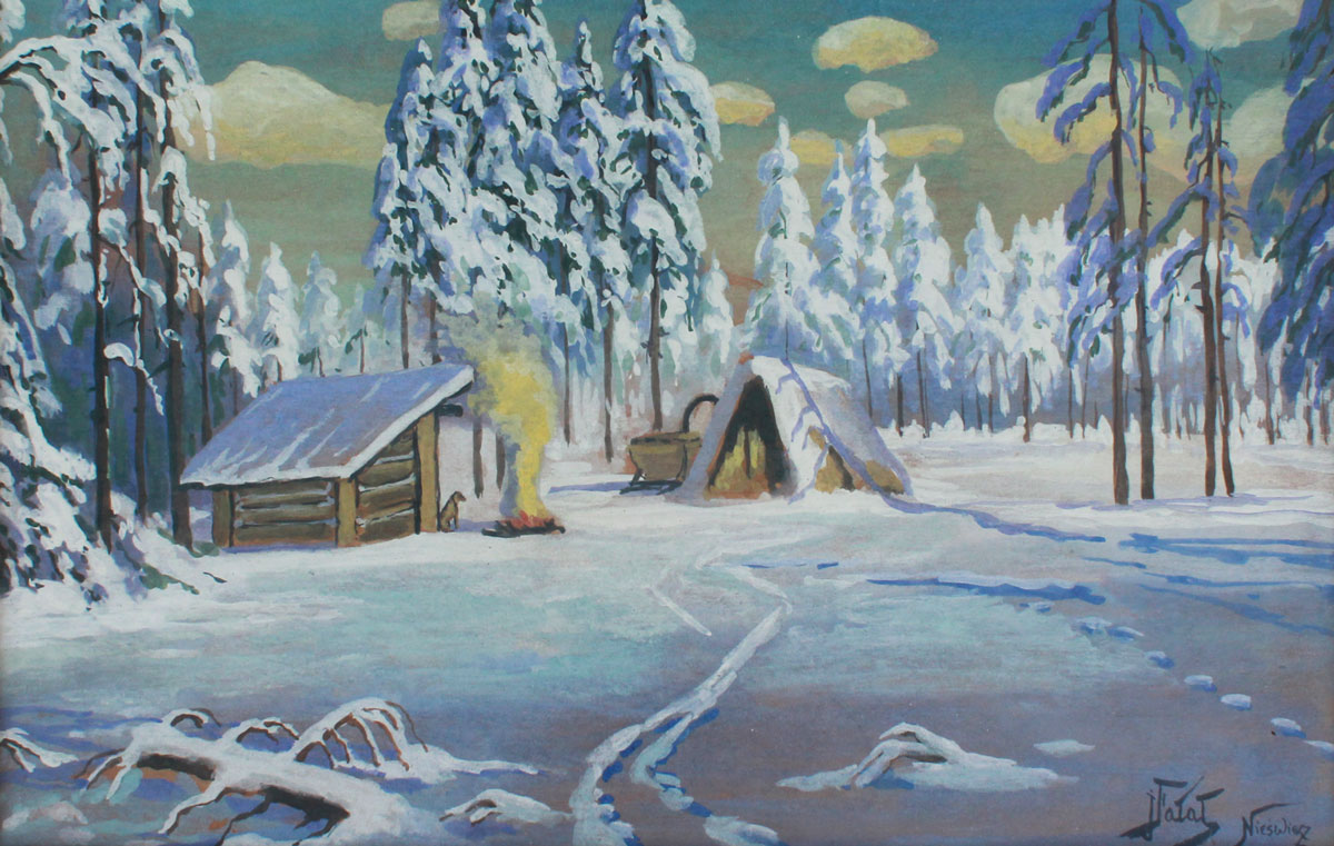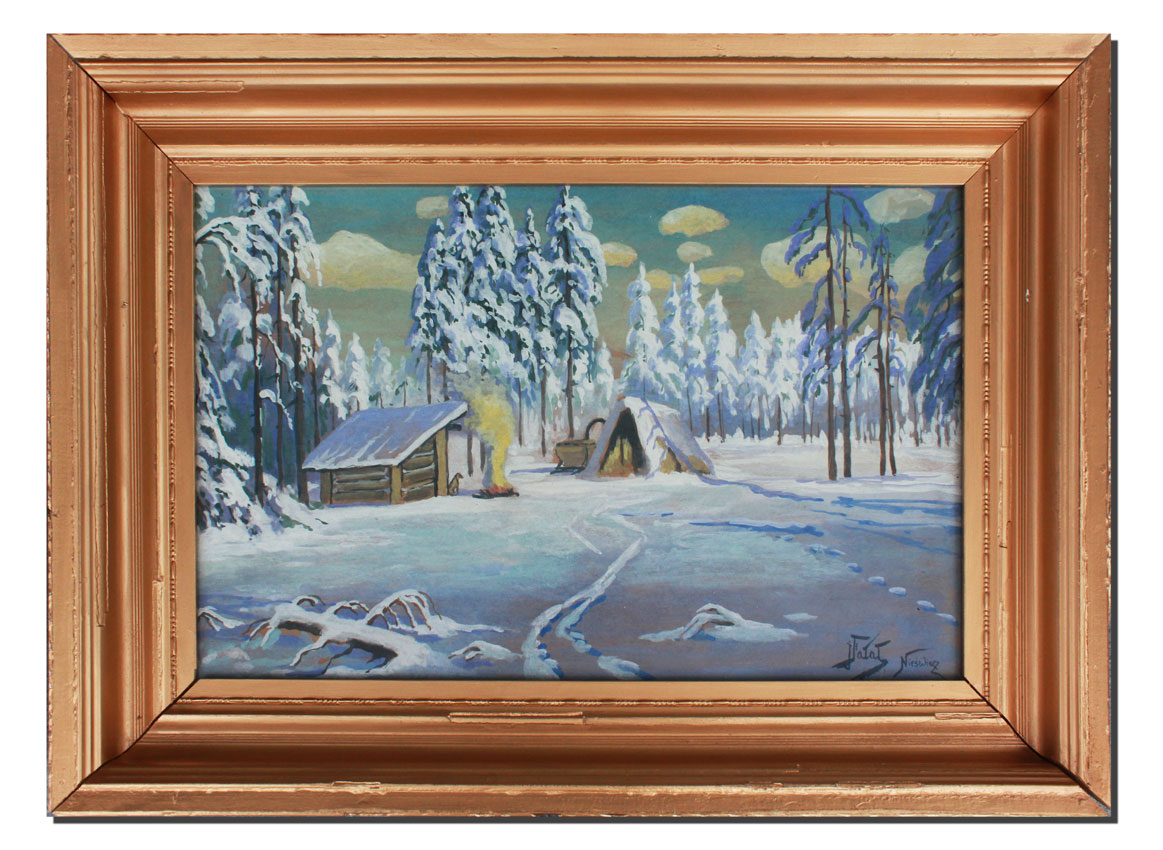 FALAT, Julian, (Polish, 1853-1929): Cabin in the Wilderness Winter, Gouache, Sight size 13 1/4'' x 21 1/4'', signed lower right, painted frame 20'' x 28'', Jacques Baruch label affixed along with illegible/Cyrillic writing verso.