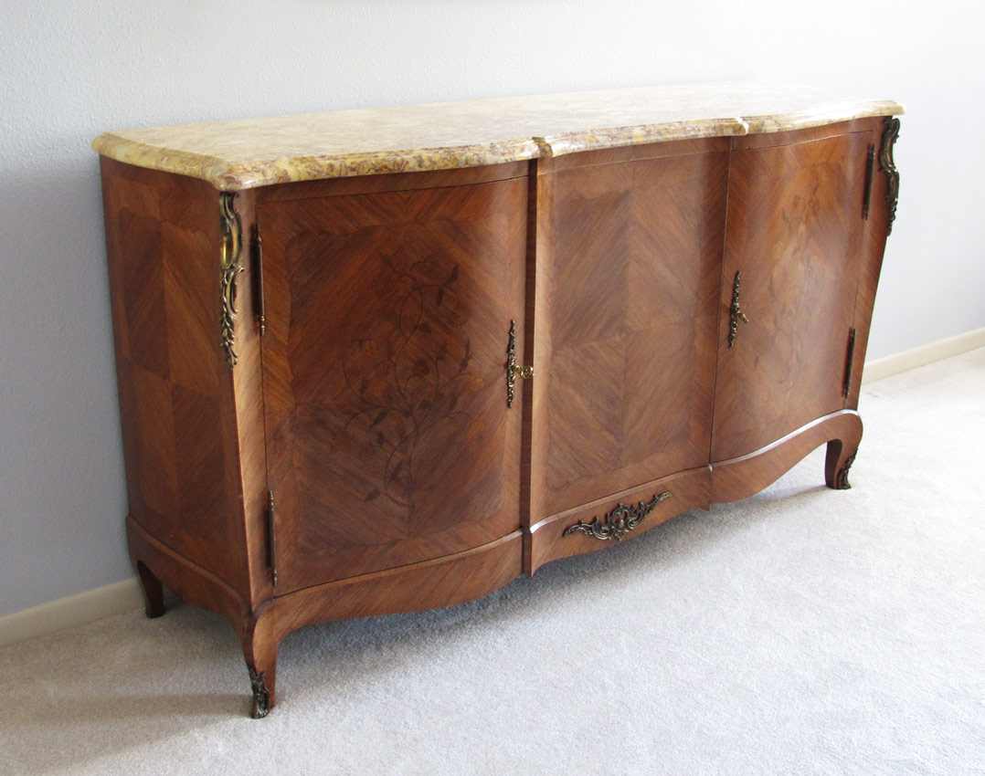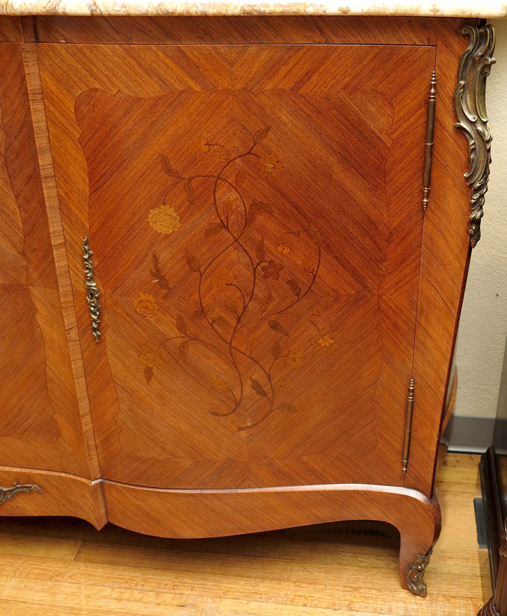 FRENCH MARBLE TOP SIDEBOARD BUFFET: Shaped marble top with hints of pinks, base with ormolu mounts on corners and skirt. Floral motif inlay on 2 of the 3 doors, 2 interior shelves, 41'' h. x 71 1/2'' x 21 1/2''.