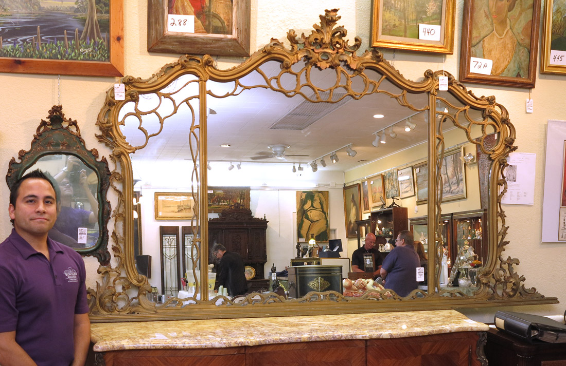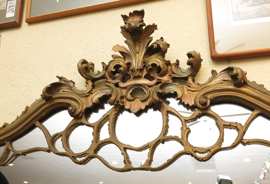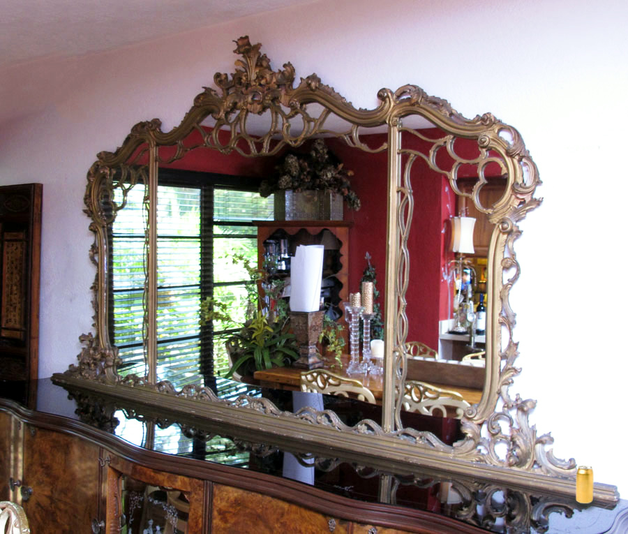 OVER 8 FT LONG ORNATE BUFFET MIRROR: Looking glass in three sections, scrolled, carved and gilt wood frame. The flat bottom is designed to rest over the buffet. Measures approx. 8'8'' length, 4'10''h.