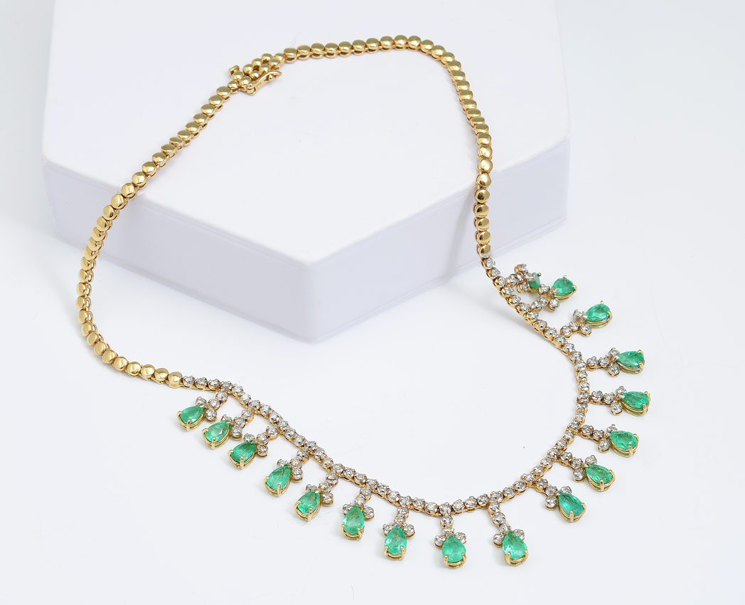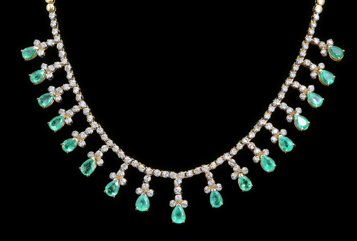 EMERALD & DIAMOND NECKLACE: 17 pear shaped emeralds dangle from a 14K yellow gold necklace. The emeralds total approx. 8.50 Ct. Enhancing the emeralds are 125 round full cut diamonds totaling approx. 8.5 Ct., rated SI-I1 in clarity and K-L-M in color. Length 16''. Weight 37.4 grams. Sold with current Florida Diamond Appraisers GIA graduates appraisal for $14,250.
