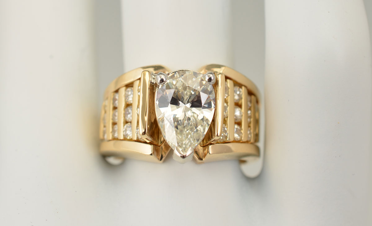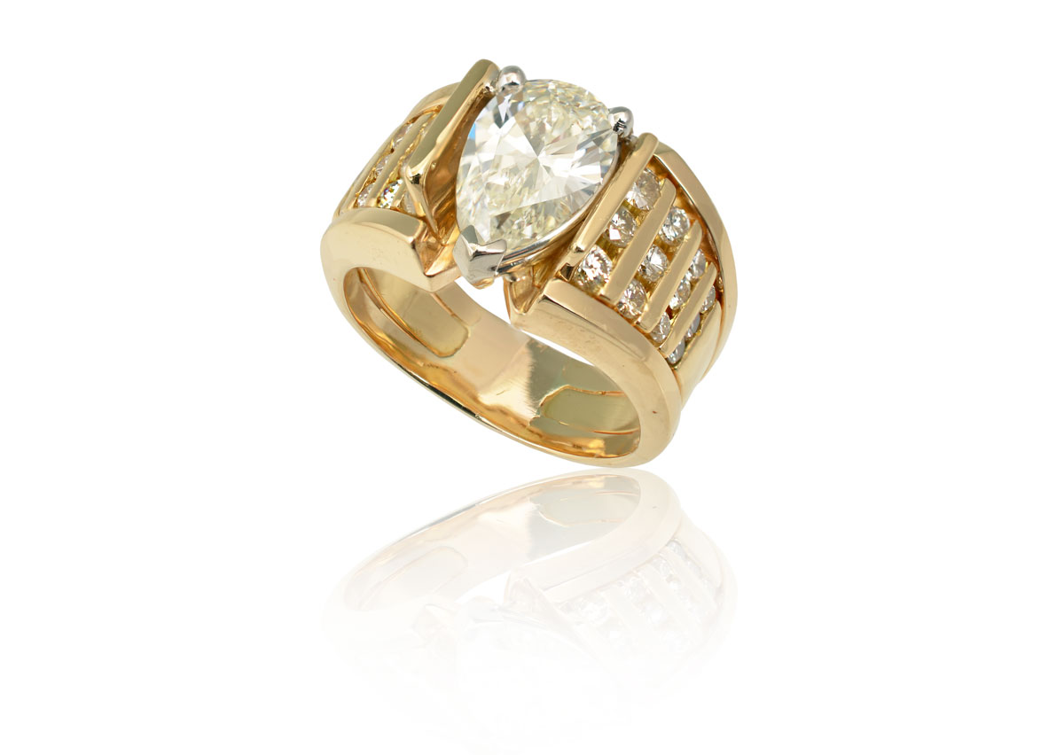 2.12 CT PEAR SHAPED DIAMOND RING: 18K yellow gold ring centers an approx. 2.12 Ct. pear brilliant cut diamond, rated VS2 in clarity and M color. On each side are rows of channel set diamonds totaling approx. .78 Ct., averaging VS-SI in clarity and H-I color. Size 7. Weight 14 grams. Sold with current Florida Diamond Appraisers GIA graduates appraisal for $13,250.