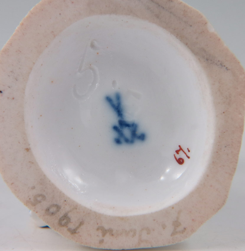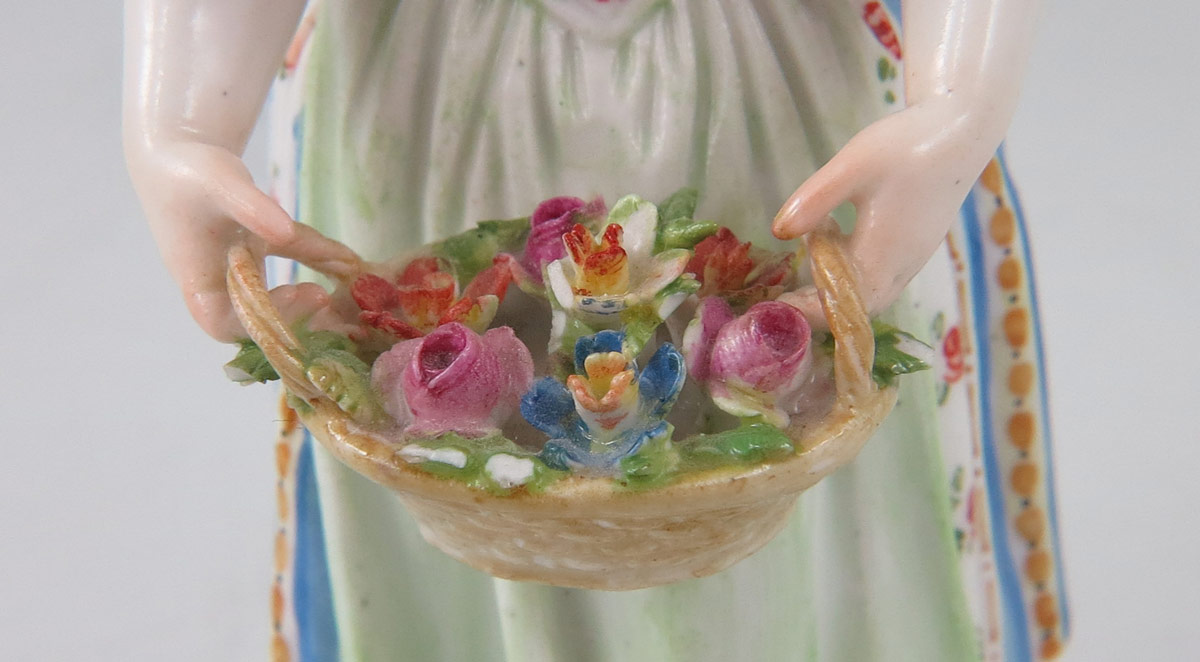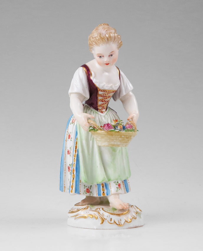 MEISSEN PORCELAIN FIGURINE: Barefoot lady flower gatherer with her basket. Blue cross swords under glaze. Approx. 5'' tall.