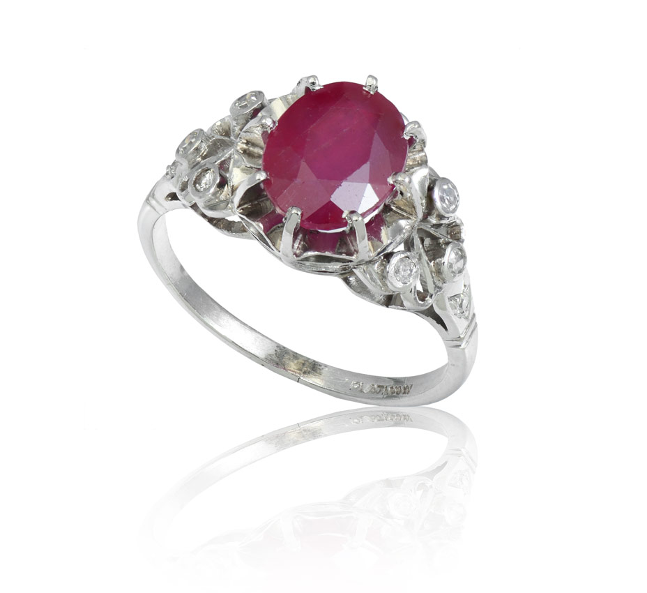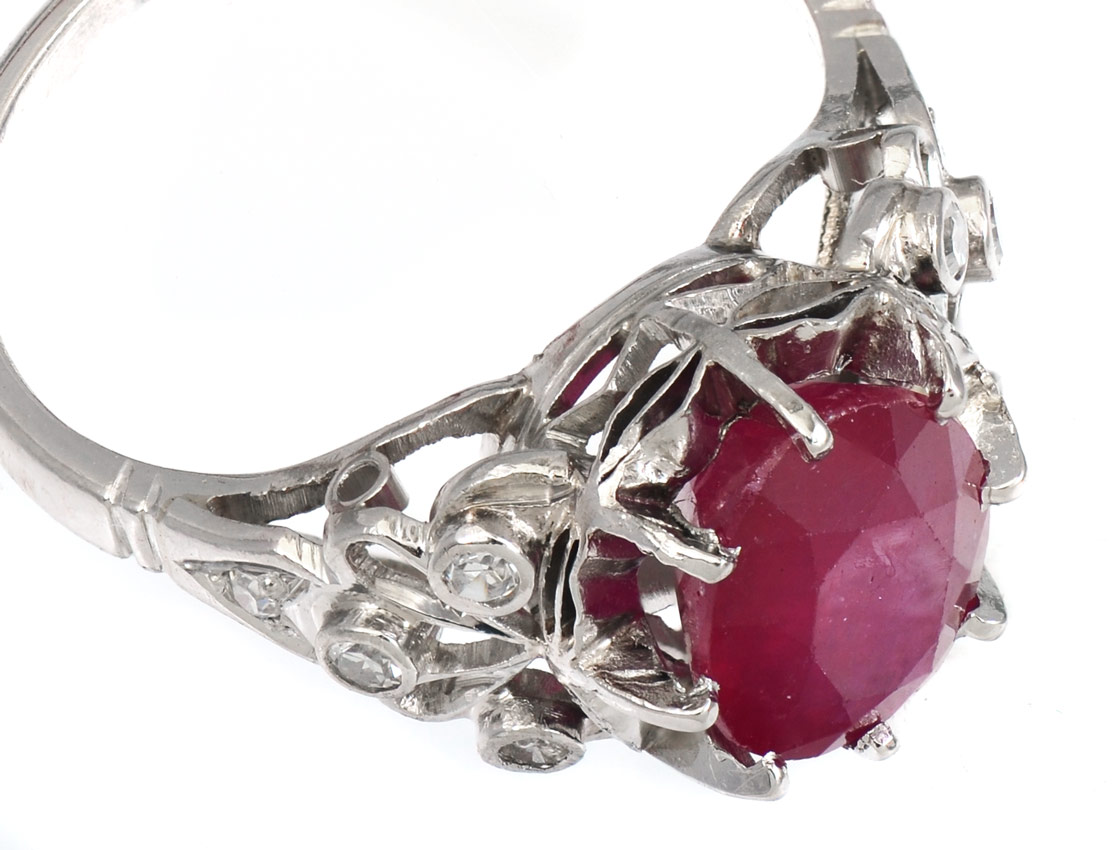 PLATINUM RUBY & DIAMOND RING: An approx. 2.80 Ct oval shaped mixed cut ruby nestled in a platinum open filigree setting. Ruby is rated SI-I in clarity (Type II) slpR in hue, 4-5 in Tone and 4 in Saturation. On the shank are 8 round single cut diamonds. Weight: .25 Ct. Approx. Rated VS-SI in clarity and G-H in color. The ruby and diamonds are prong set. Size 5.25. Weight: 5.0 grams.