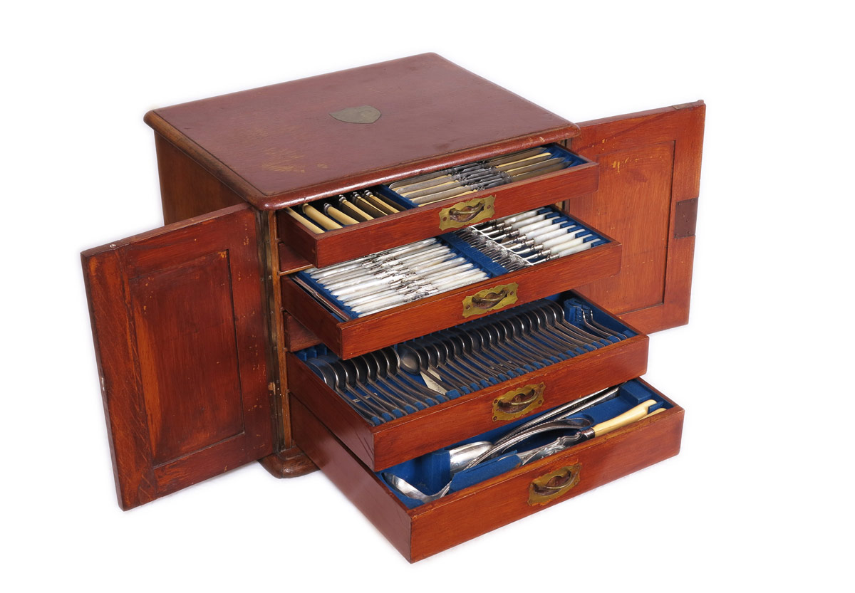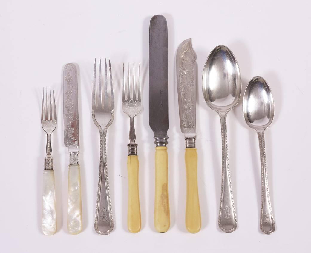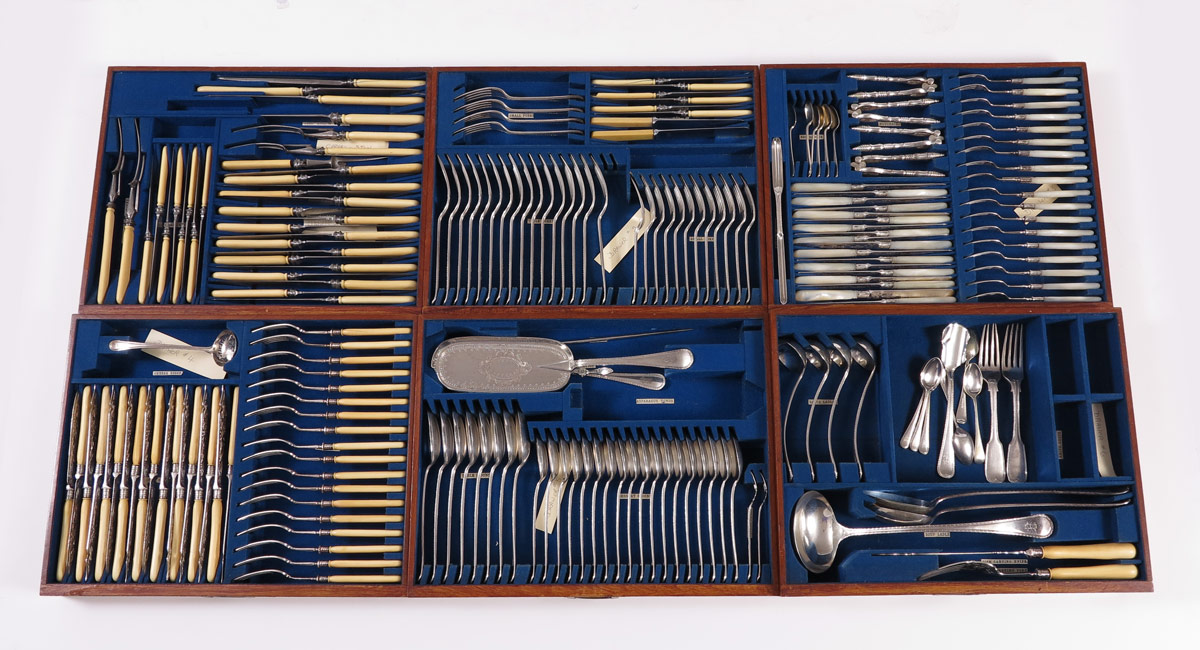 LARGE COLLECTION OF ELKINGTON SILVERPLATE FLATWARE: An assembled approx. 185 piece collection to include 1) 16 forks (8 1/4''), 12 salad forks (7''), 18 dessert spoons (7 3/4''), 8 tablespoons (8 3/4''), 2 pickle forks (5 1/4''), 4 sauce ladles (7 1/4''), punch ladle (13'') 2 large serving spoons (13''), 3 demitasse spoons (4 3/4''), cheese scoop (7 3/4''), 6 egg spoons (4 3/8''), marrow scoop (9''), 4 nut crackers (5''). 2) Faux ivory handle pieces to include 17 table knives (10 5/8''), 8 knives (8 3/4), 5 carving forks (largest 10 1/4''), 3 carving knives (longest 13''), fish carving set (fork 10 1/4'', knife 12 3/4''), 18 fish knives (9 1/2''), 18 fish forks (8''). 3) Faux mother of pearl handle pieces to include 18 dessert forks (7''), 18 dessert knives (8 1/4''). Sold in large wood silver chest with 6 drawers behind 2 doors. 16 1/2'' h. x 20 3/4'' x 16 1/2''.