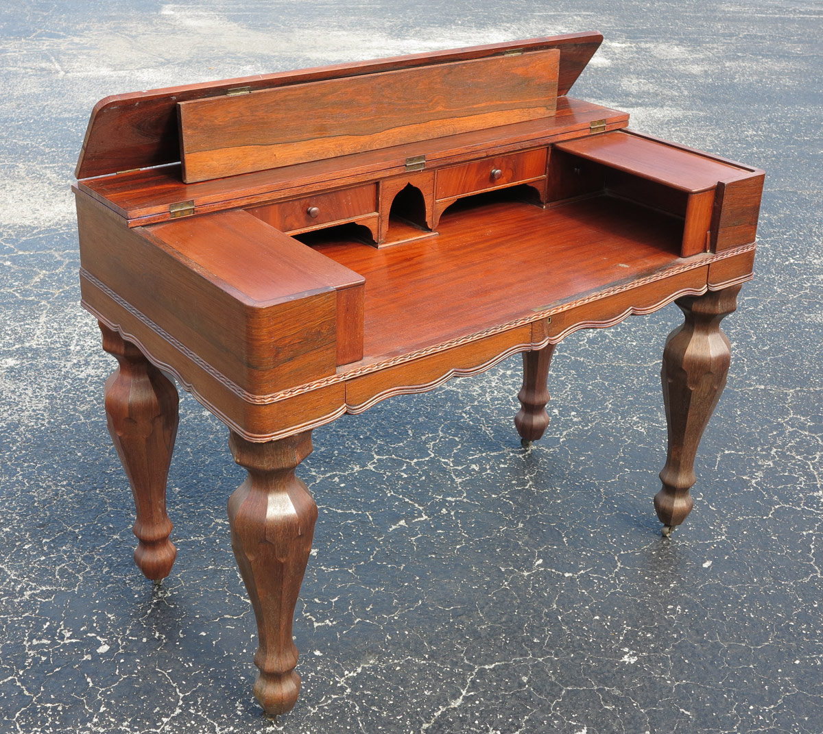 19TH CENTURY ROSEWOOD SPINET DESK: Circa mid 19th century, top opens to reveal 2 drawers with pigeon holes, carved decoration, shaped skirt with 2 drawers. Carved legs on castors. 33 3/4'' h. x 46 3/4'' x 24 1/4''.