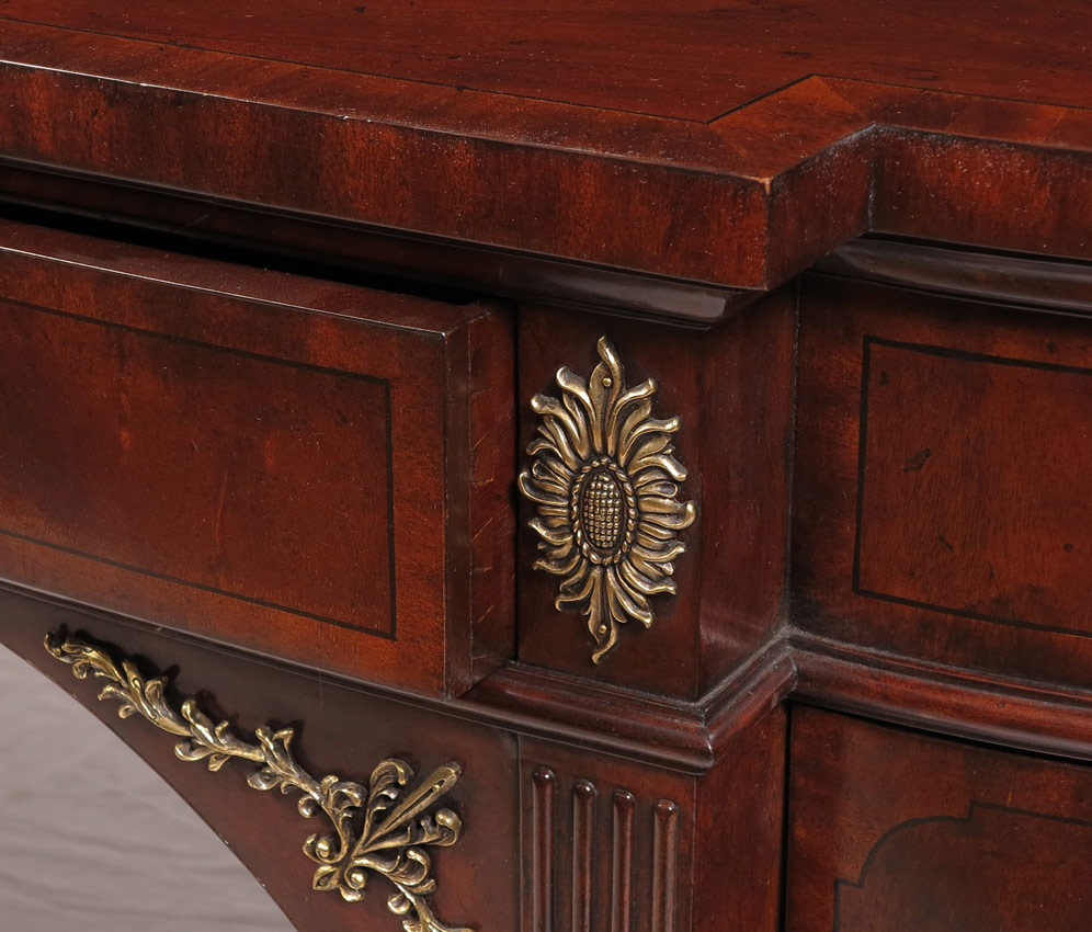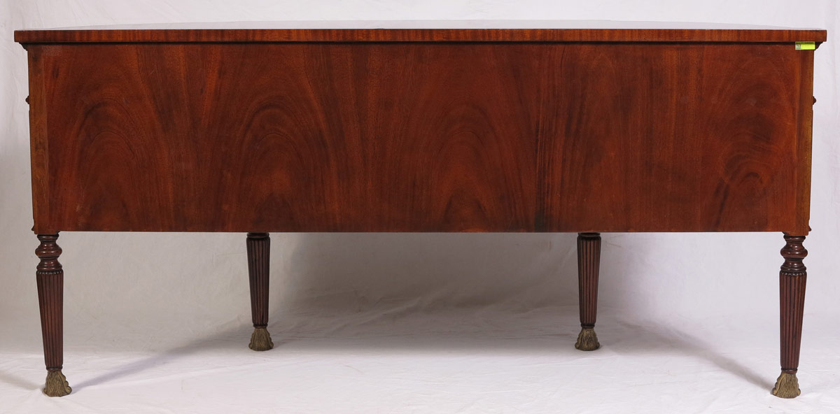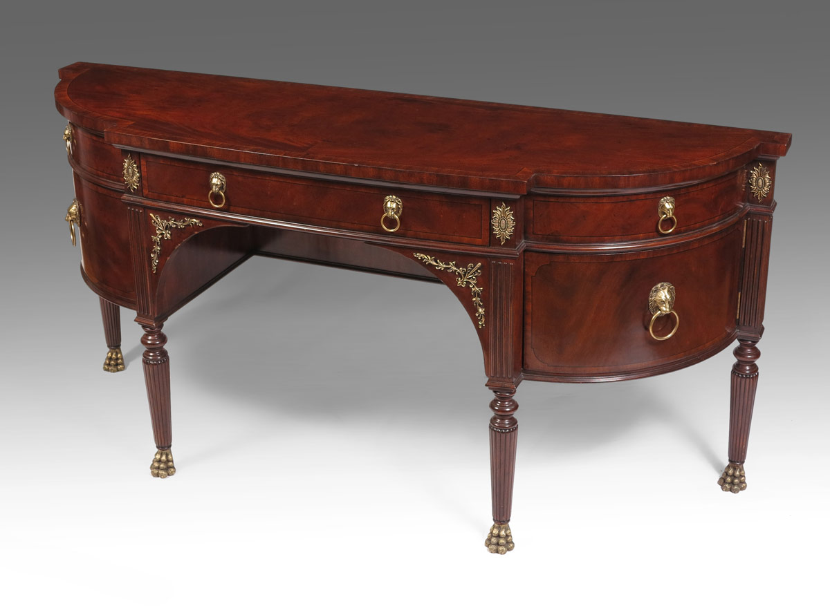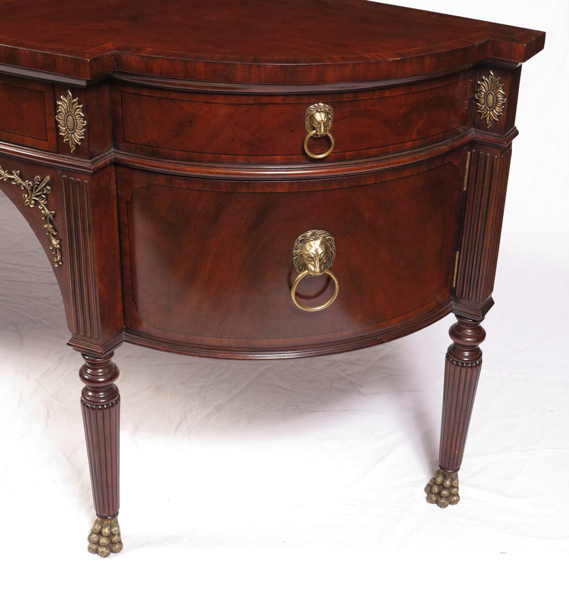 BANDED MAHOGANY SIDE BOARD: Bow sided with 3 drawers over two doors, reeded leg, paw feet, lion's head pulls. Measures approx. 33'' tall x 72'' x 24''.