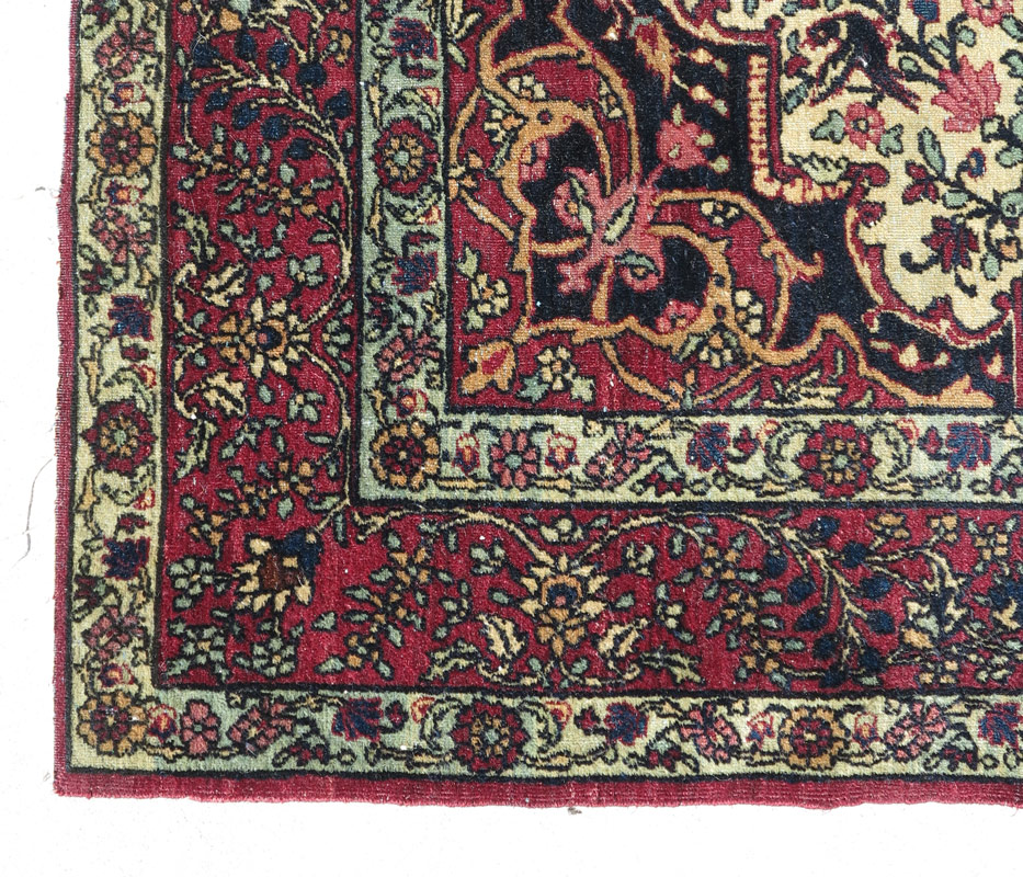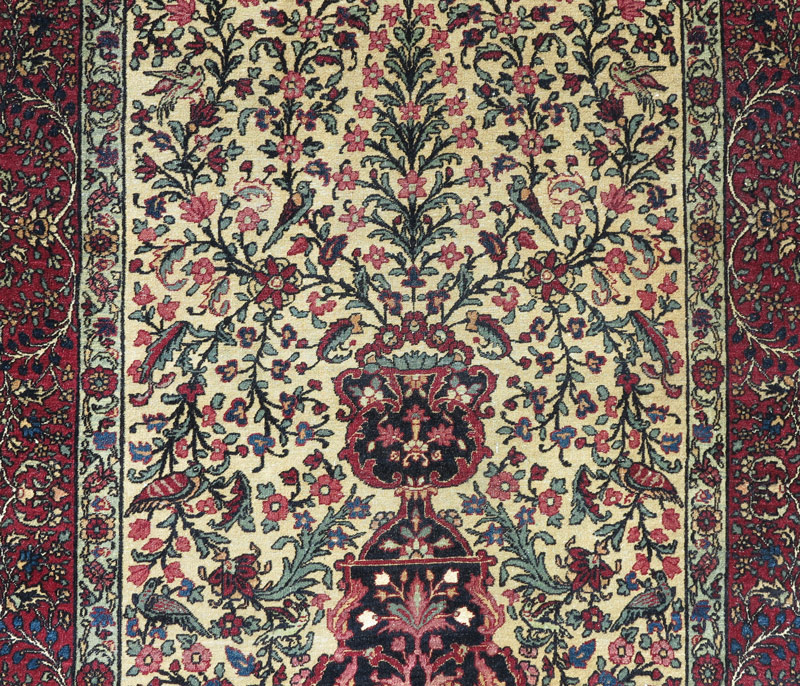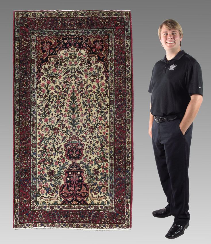 ANTIQUE PERSIAN KERMANSHAH HAND KNOTTED WOOL RUG, 4' 3 1/2'' x 7': This antique rug has a beautiful traditional design consisting of a ''tree of life'' growing up out of a large vase on a stand. The red and black colored vase and plinth are in dramatic contrast to the white field of the rug. The branches of the tree have various flowers growing out to the side and also to the top of the rug where the corners of the field are rounded to give the effect of an arbor over the scene. Hidden in the branches of the tree are pairs of different birds, the pairs facing each other from each side of the rug. The colors used to color the leaves, branches, birds, and flowers, are soft rose burgundy, pale turquoise blue, and yellow beige. At the base of the rug are found two pairs of bunnies hopping to the center of the rug. They are a symbol of married bliss and fertility. The main border of the rug has the rich burgundy ground and it is flanked by guard borders in the pale turquoise blue. This collectors piece would make a dramatic statement in the entryway of your home.