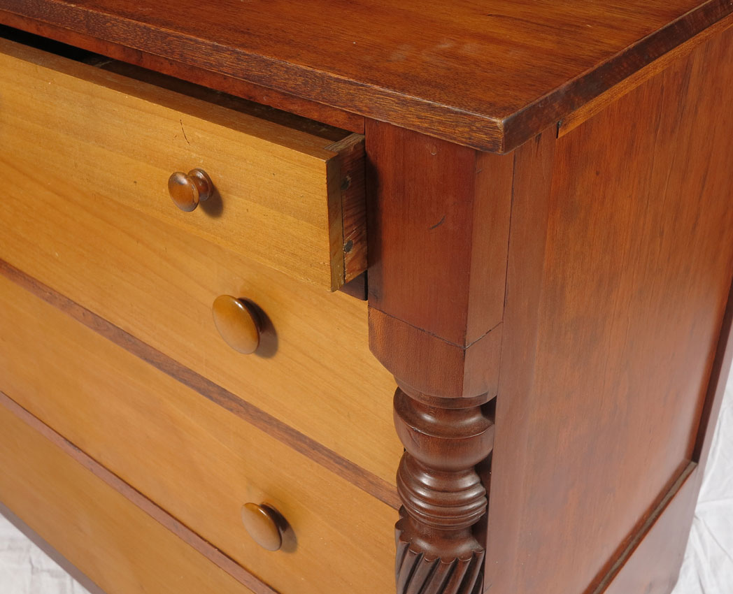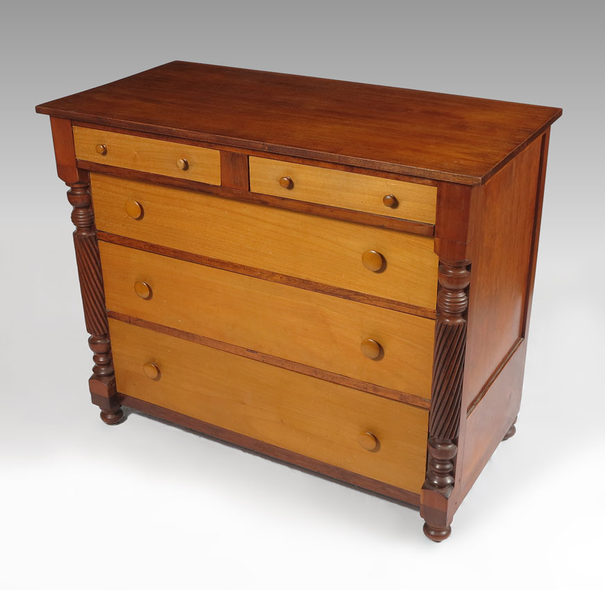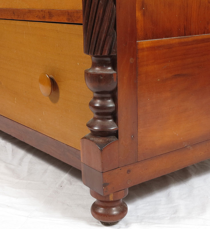 LATE 19th C CHEST OF DRAWERS: Mixed woods, 2 over 3 drawers, spiral carved stiles. 39'' tall x 47'' x 23.5''.