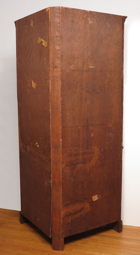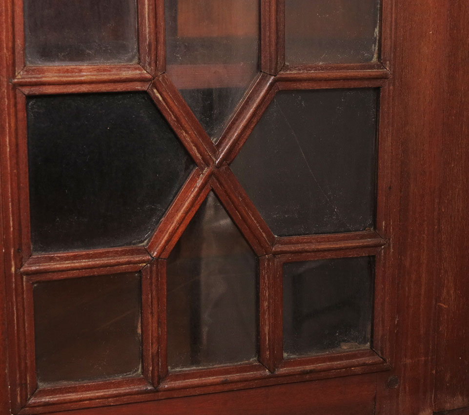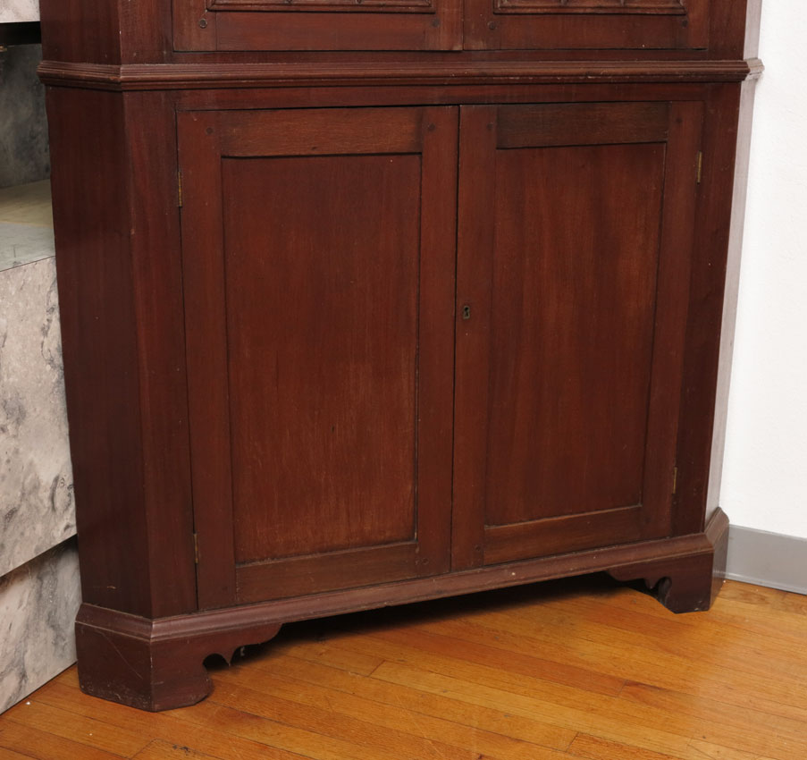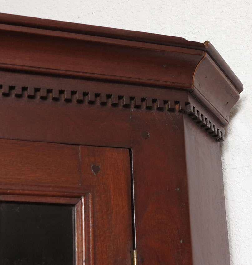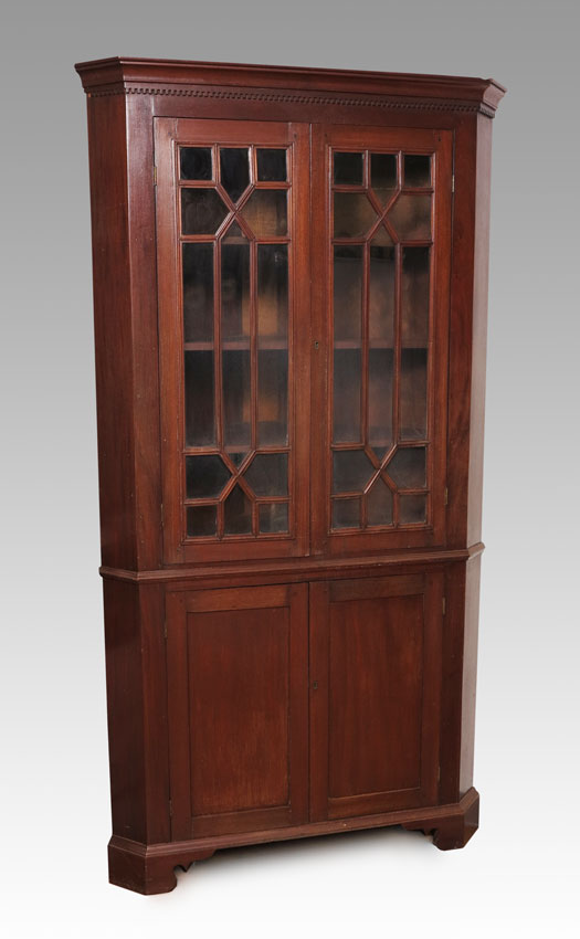 AMERICAN COUNTRY MAHOGANY CORNER CABINET: Dentil molding over 2 individually glazed glass doors The interior with 3 shelves. Paneled double doors at the base. Canted corners. 85 1/2'' h. x 45 1/2'' x 24 1/2''. One part.