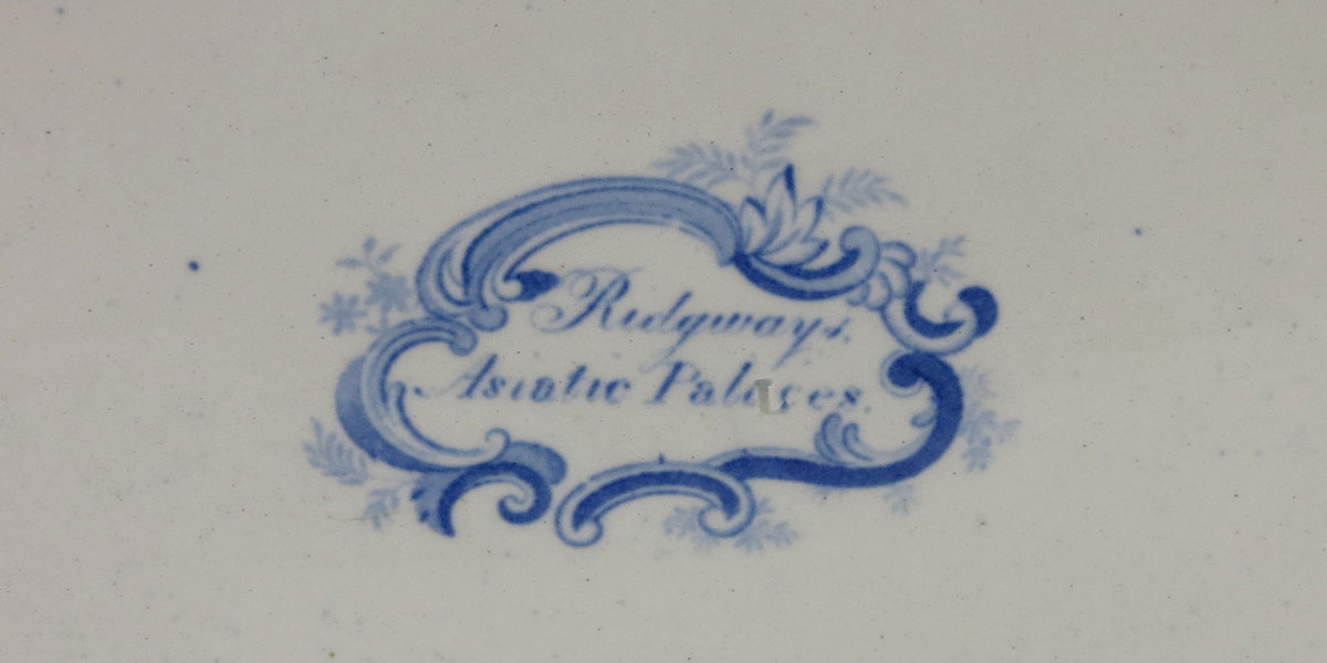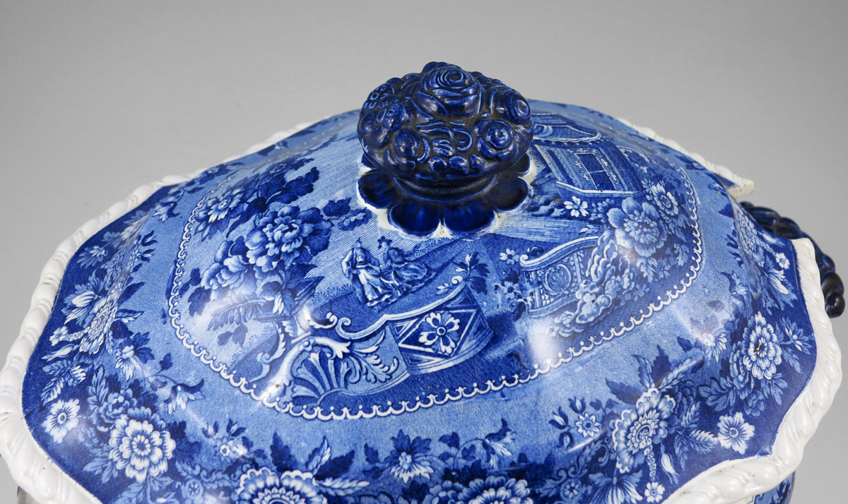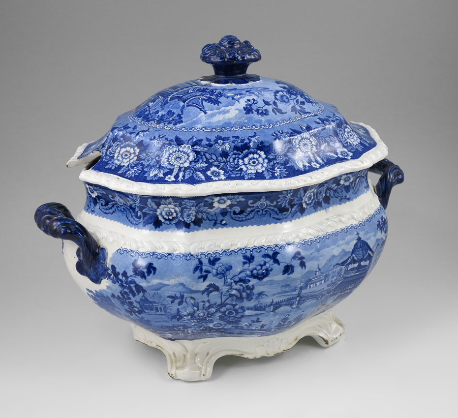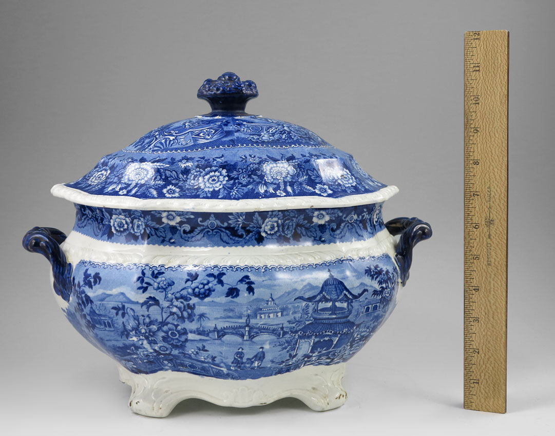 RIDGEWAYS ASIATIC PALACES COVERED SOUP TUREEN: Stoke on Trent English blue and white transfer design. Ca. 1879-1920. Measures approx. 11'' tall x 14'' from handle to handle.