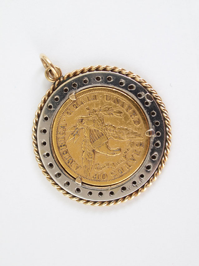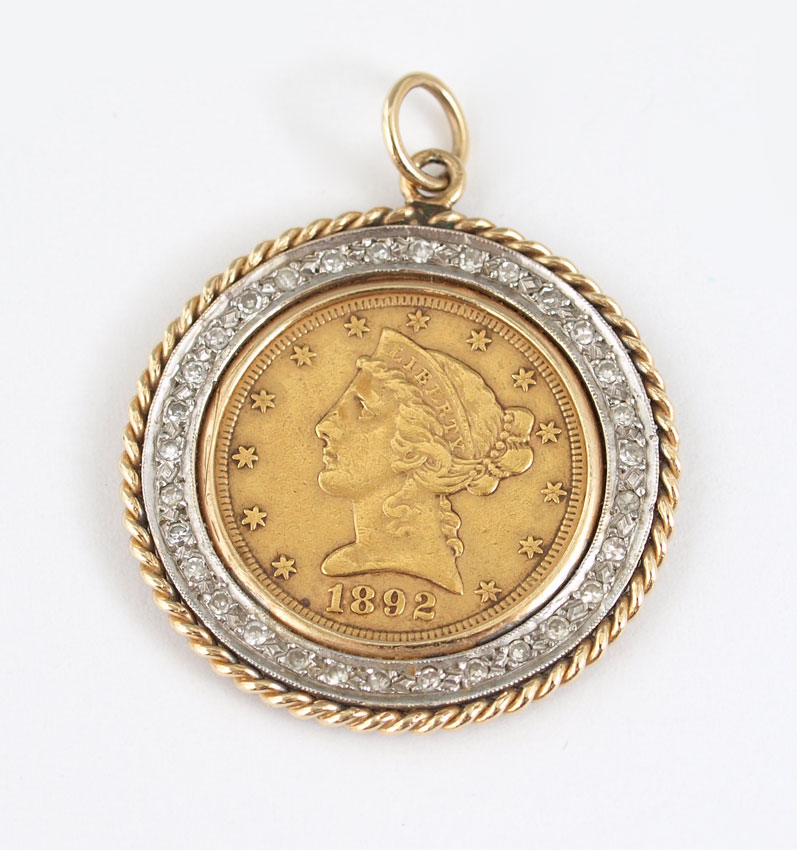 1892 US GOLD FIVE DOLLAR COIN PENDANT: Coin mounted in a 14K yellow gold frame with 31 round single cut diamonds totaling approx. .25 Ct.. rated VS in clarity and H-I in color. Frame weight: 14.9