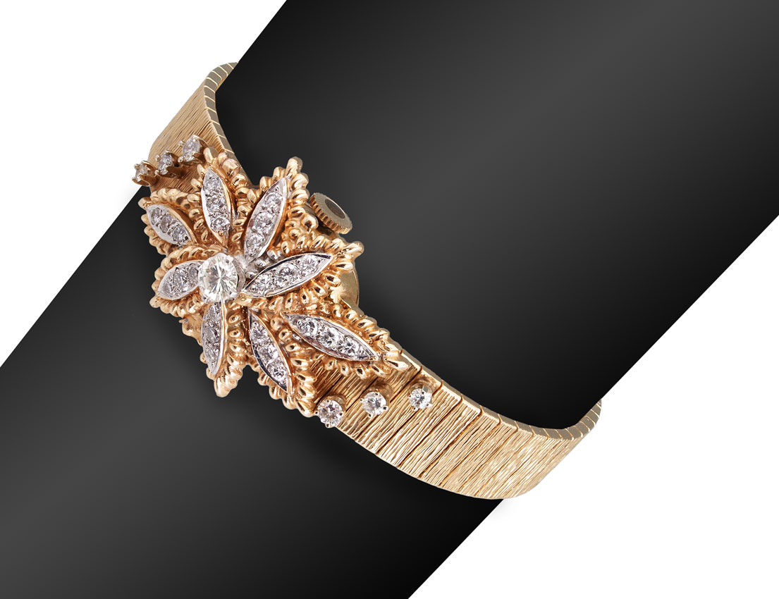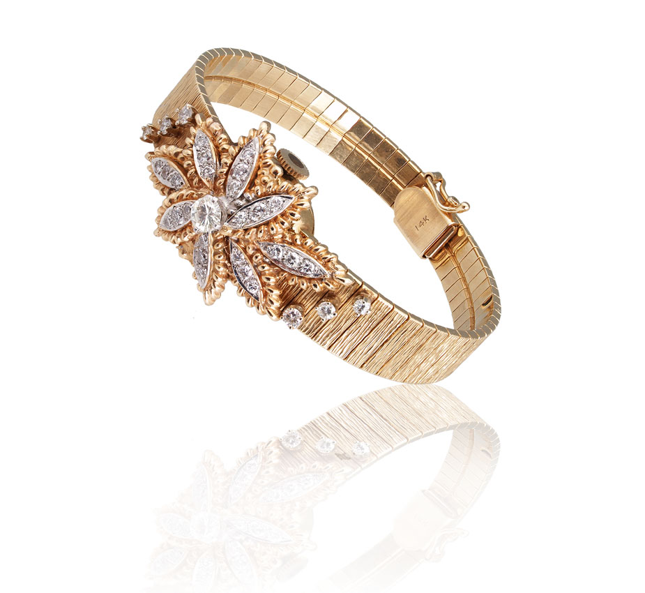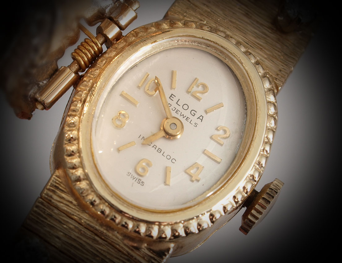 14K DIAMOND COVERED WRISTWATCH BRACELET: 14K yellow gold covered ELOGA wristwatch contains 28 round brilliant cut diamonds. Weight: 1.00 Ct. Approx. Rated VS in clarity and G-H in color. Mechanical Incabloc jeweled movement is running. Mesh link bracelet. Weight: 33.2 grams. Length: 6''