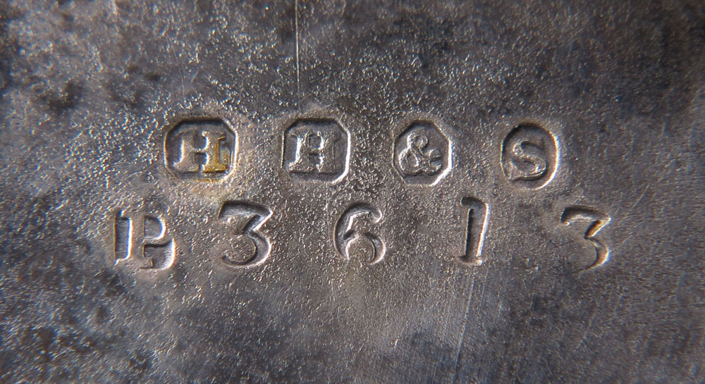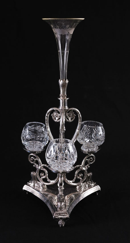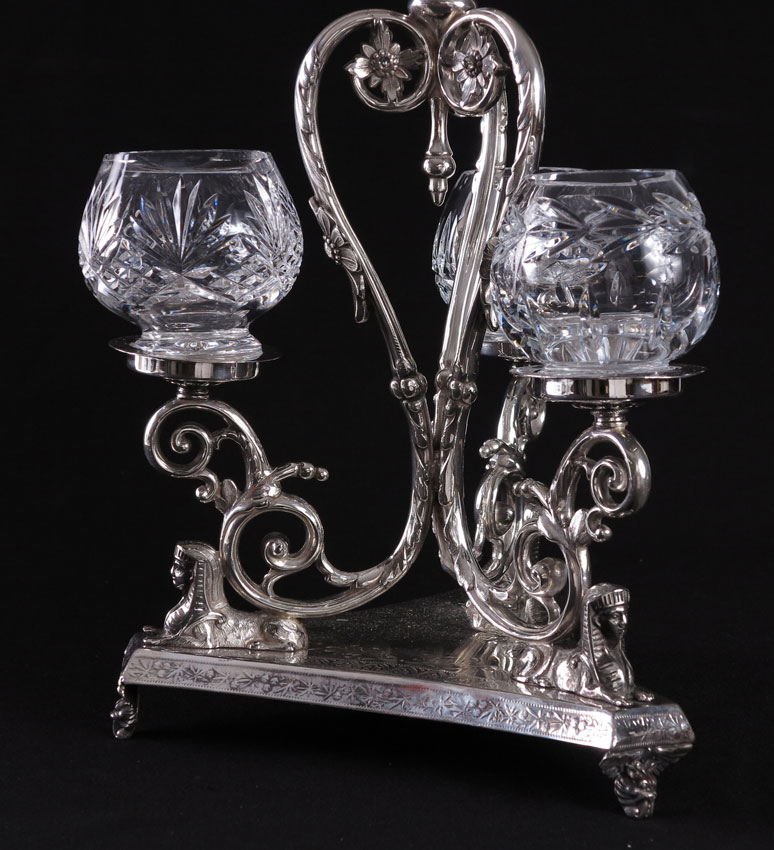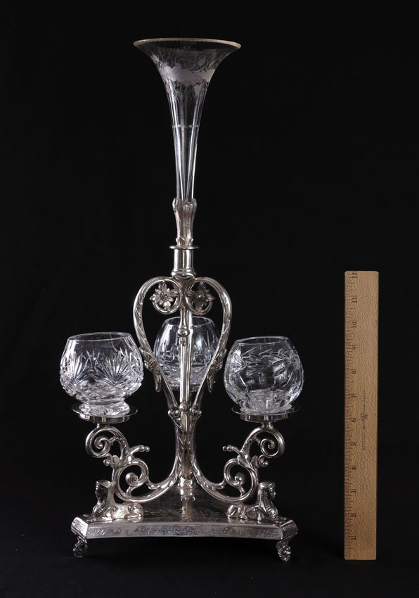 HENRY HOBSON & SONS ENGLISH SILVERPLATE EPERGNE: Etched glass center bud vase over silverplate base with foliate and Egyptian Revival motifs. Marked on base H.H. & S, 43613. Sold with cut glass jars of different patterns. Measures 21 1/4'' h. x 8 1/2'' dia.