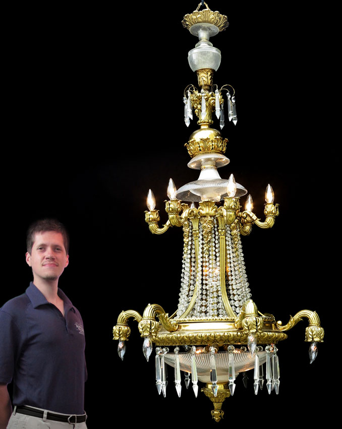 ELEGANT 12 LIGHT BRONZE & CRYSTAL CHANDELIER: Bronze & metal construction with crystal inserts, prisms, drops and garland. Overall approx. 58 1/2'' h. x 30 1/2'' dia.