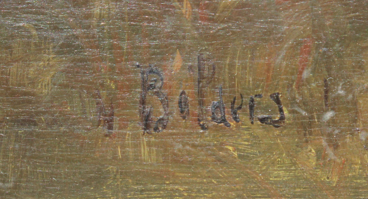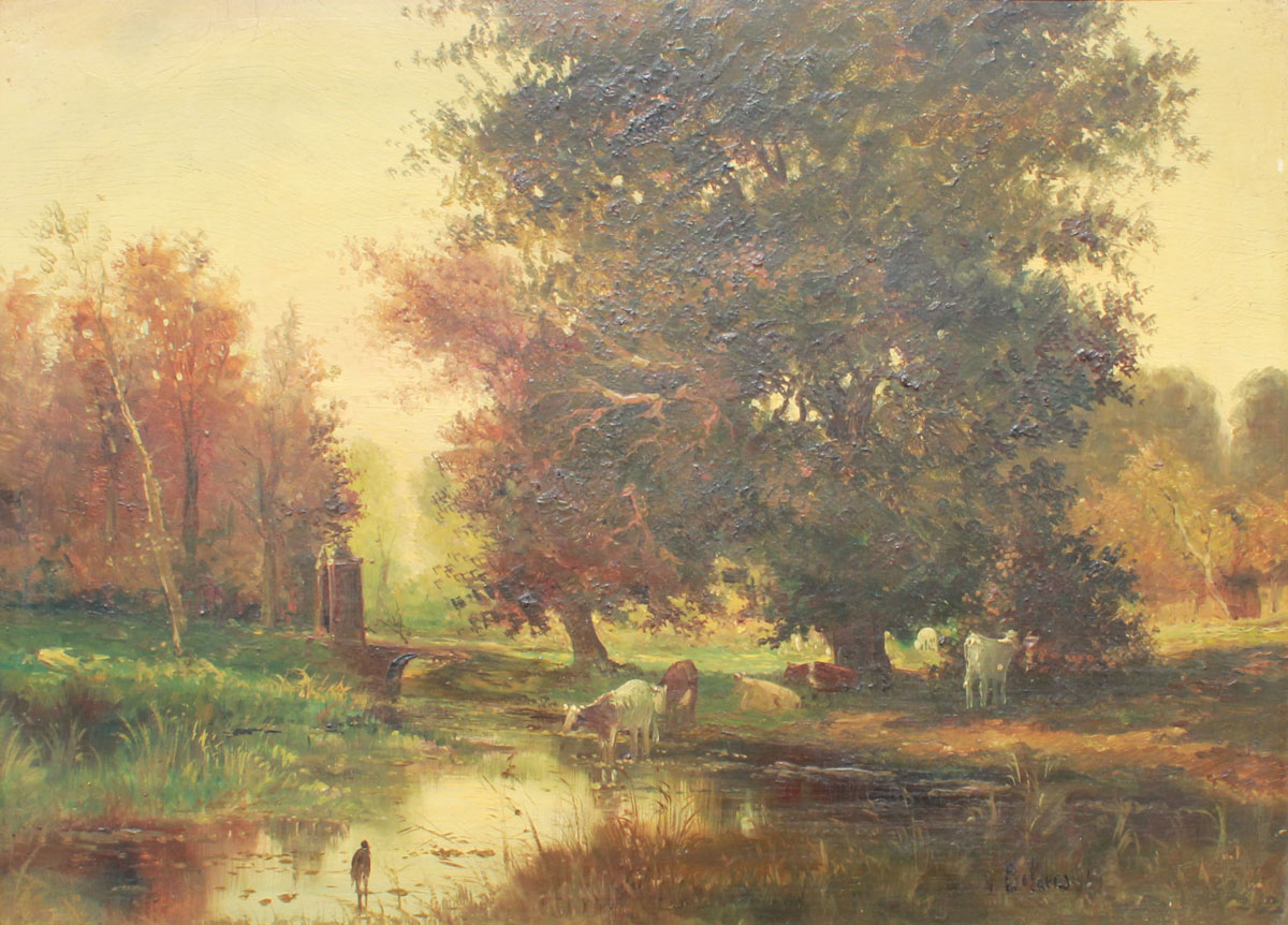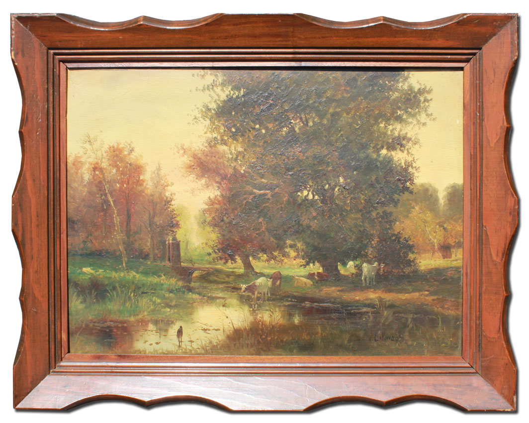 GOOD PASTORIAL LANDSCAPE DEPICTING COWS WATERING: Oil/Wood, 11 5/8'' x 16'', illegibly signed lower right, encased in carved wood frame with wear, 15'' x 19''.