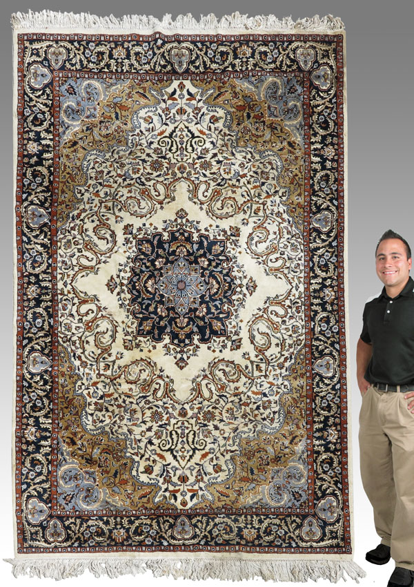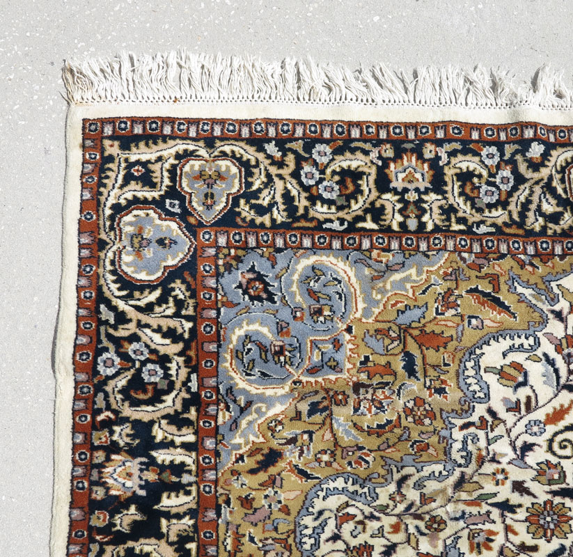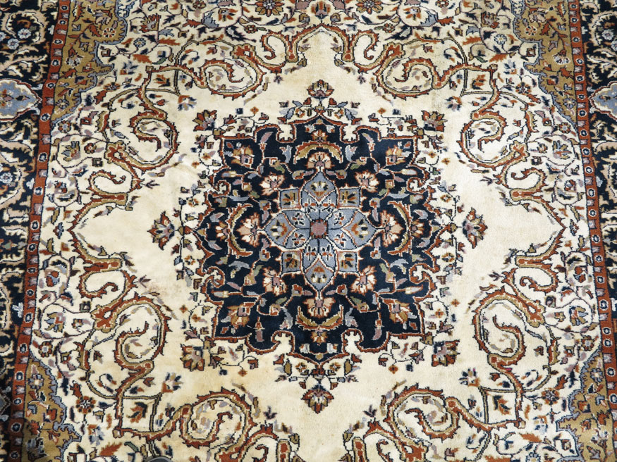 INDO PERSIAN HAND KNOTTED WOOL RUG, 6' x 8'10'': This rug has an ivory field covered with overall pattern of vines connecting leaves, flowers and paisleys around a dark and medium blue central medallion. The corners of the field are medium blue and pale gold, the main border has the deep blue like the central medallion. This is an attractive well-made rug. Condition is good.