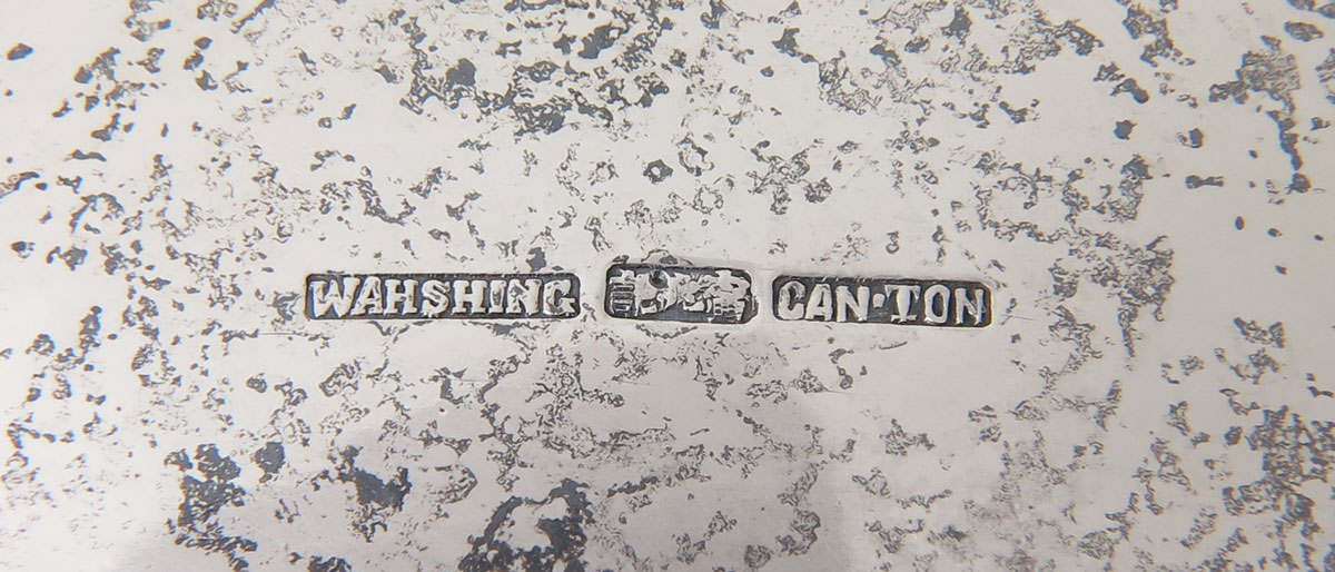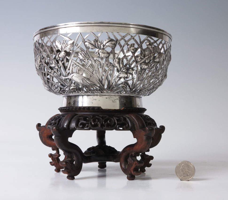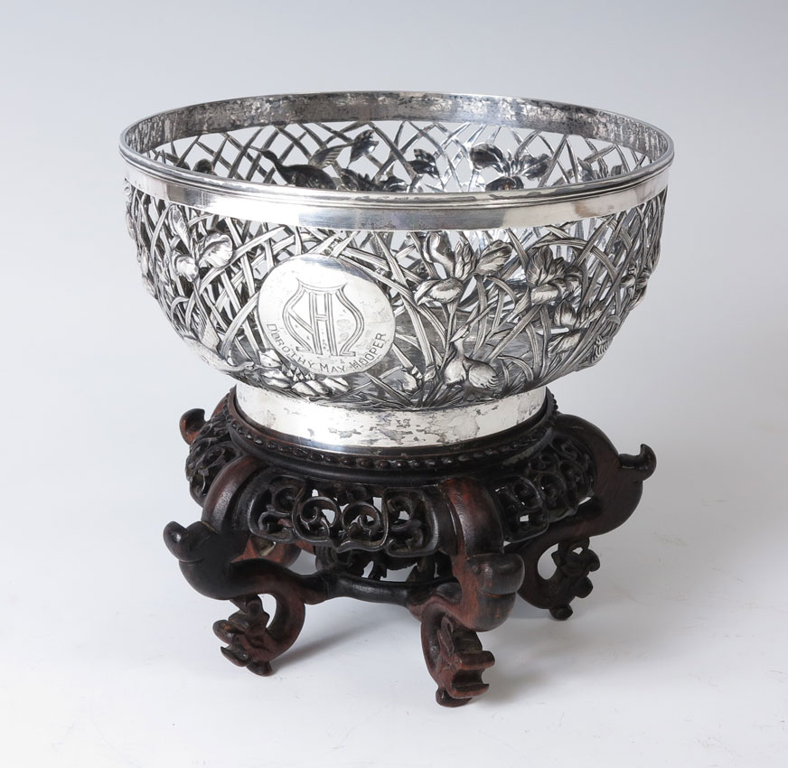 CHINESE EXPORT RETICULATED SILVER BOWL: Pierced and embossed body with cranes among the iris and long grass. Wahshing Canton separated by characters mark to bottom. Monogrammed and inscribed on plaque ''Dorothy May Hooper'', 12.25 oz., 3 7/8'' h. x 7 1/2''. Sold with carved wood base 3 1/2'' h. x 7 1/2''.