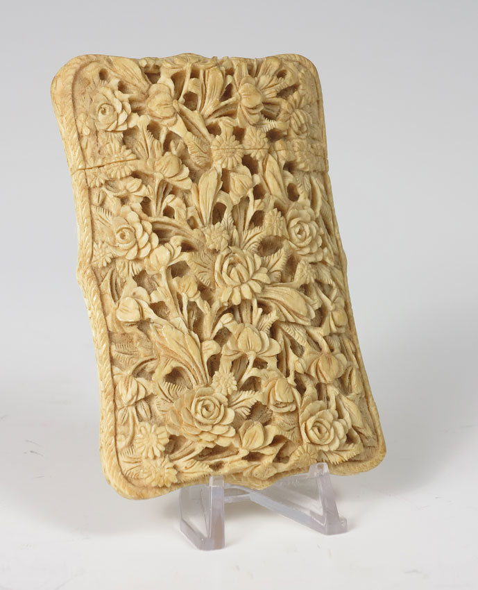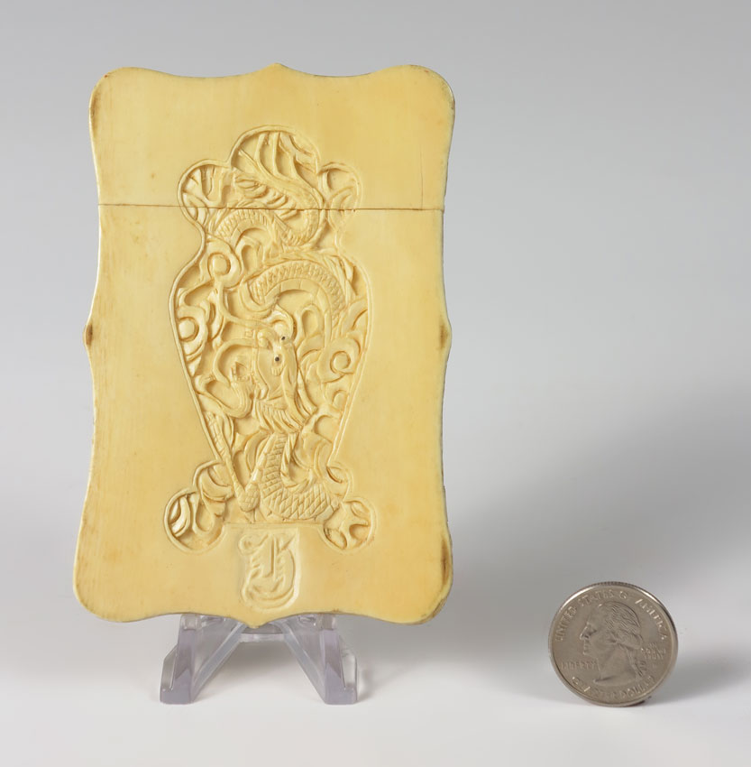 CHINESE CARVED IVORY CARD CASE: Detail relief carved floral motif front, dragon / serpent motif on back with monogram. Measures 4 1/8'' x 2 3/4''.