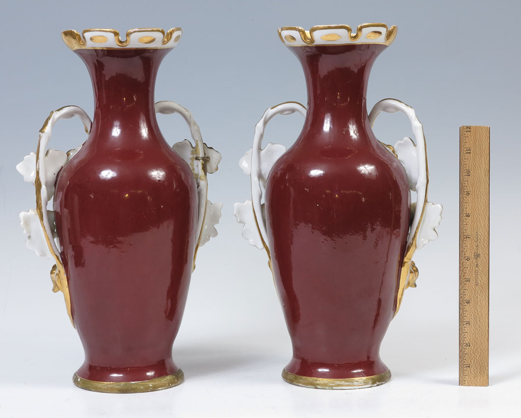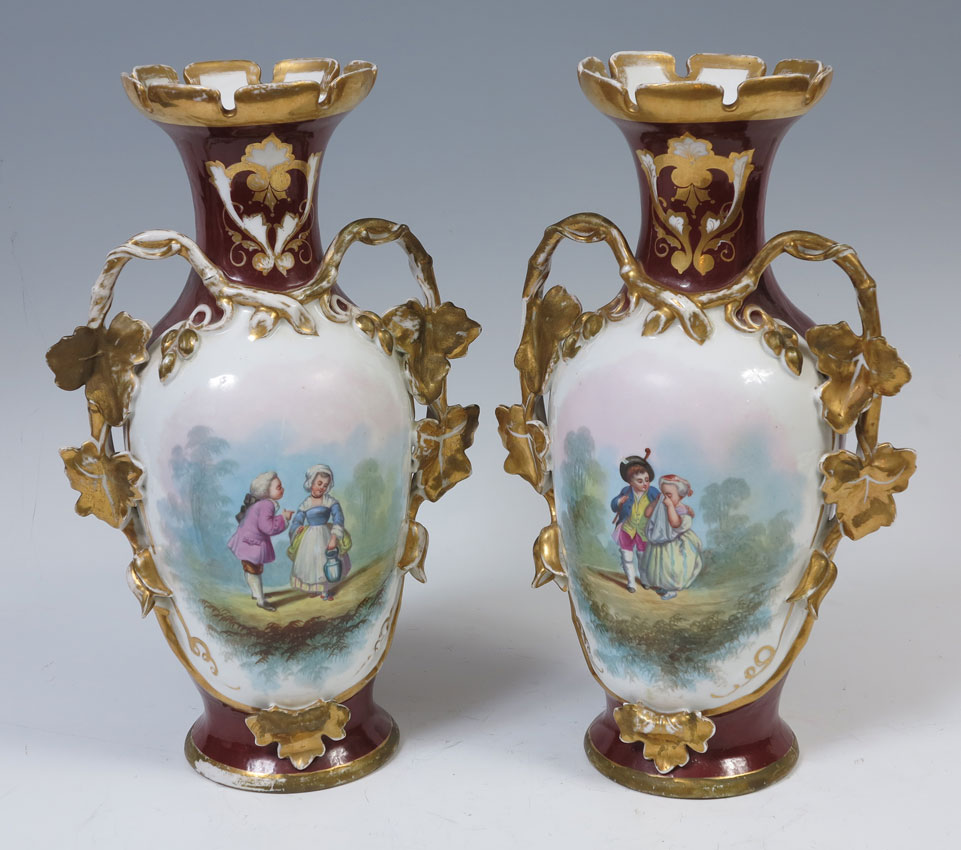 PAIR OLD PARIS PORCELAIN VASES: 17'' tall, 10'' at the widest. Image of young courters.