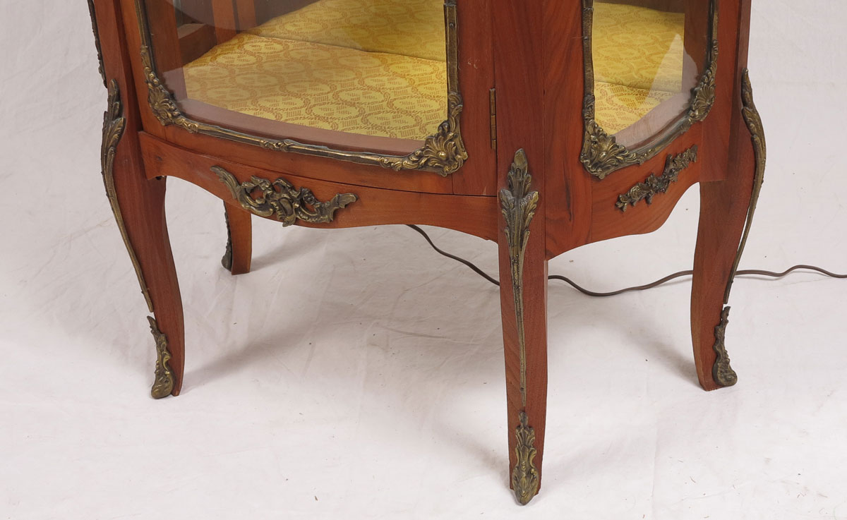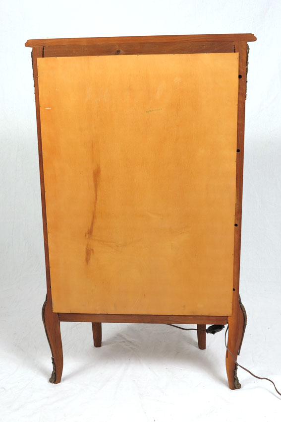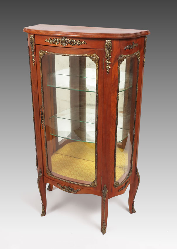 FRENCH STYLE CURIO VITRINE CABINET: 20th century production, applied ormolu decoration, mirrored back with 2 glass shelves. On shaped legs. Marked Made in Canada on back. 46 3/4'' h. x 27 1/2'' x 12 1/2''.