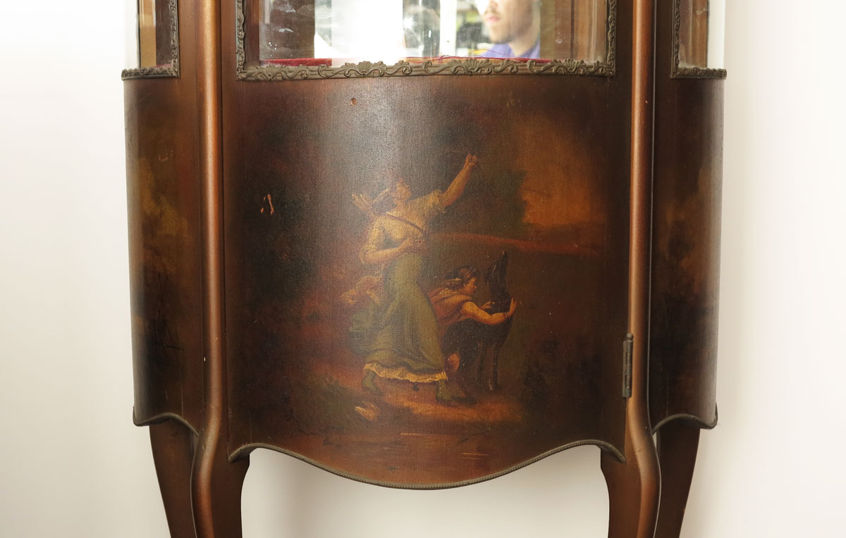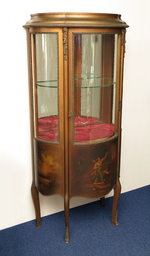 PAINT DECORATED FRENCH VITRINE CURIO CABINET: Triple bow glass front and sides, painted and gilt finish, mirror back interior with glass shelf. Measures approx. 53 1/2'' x 26'' x 16''.