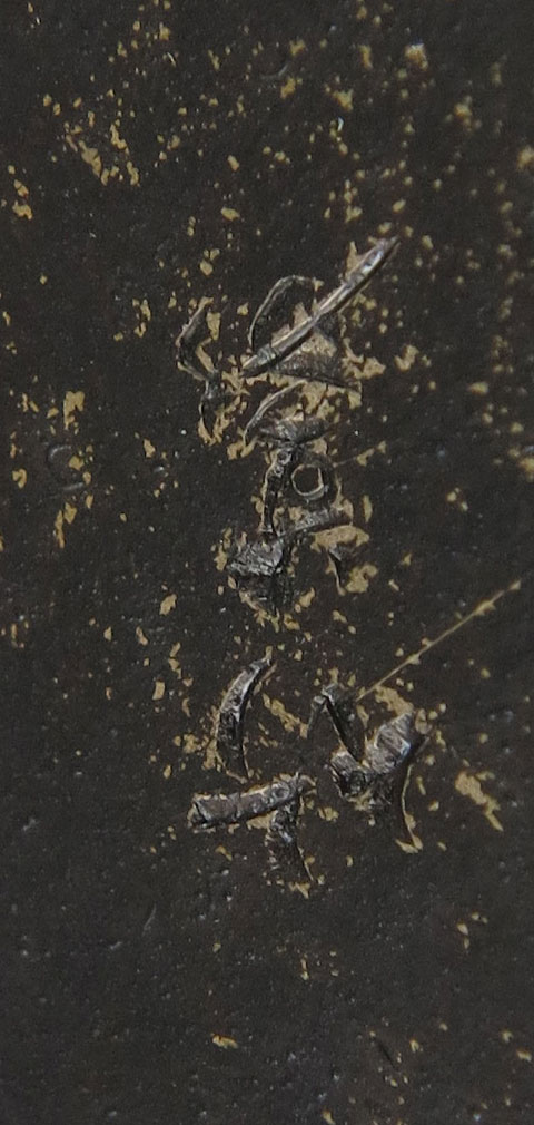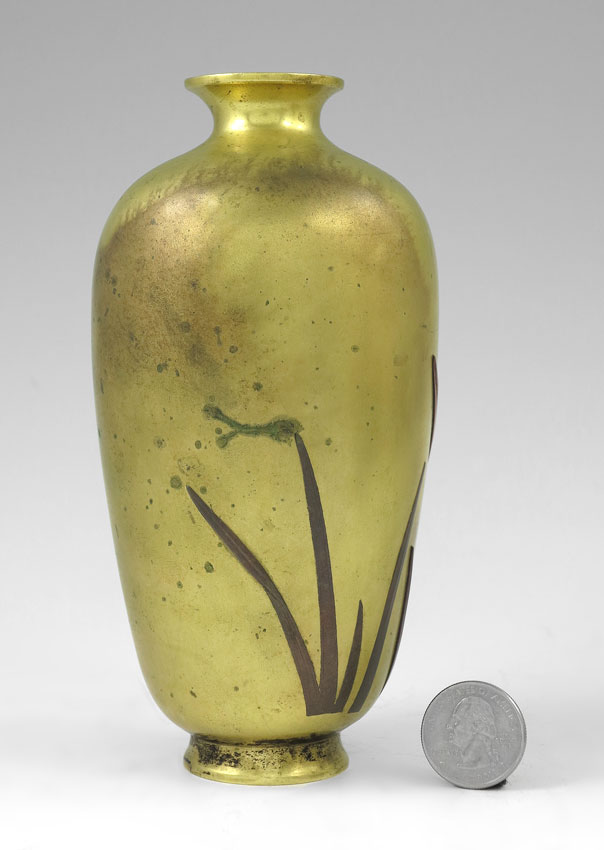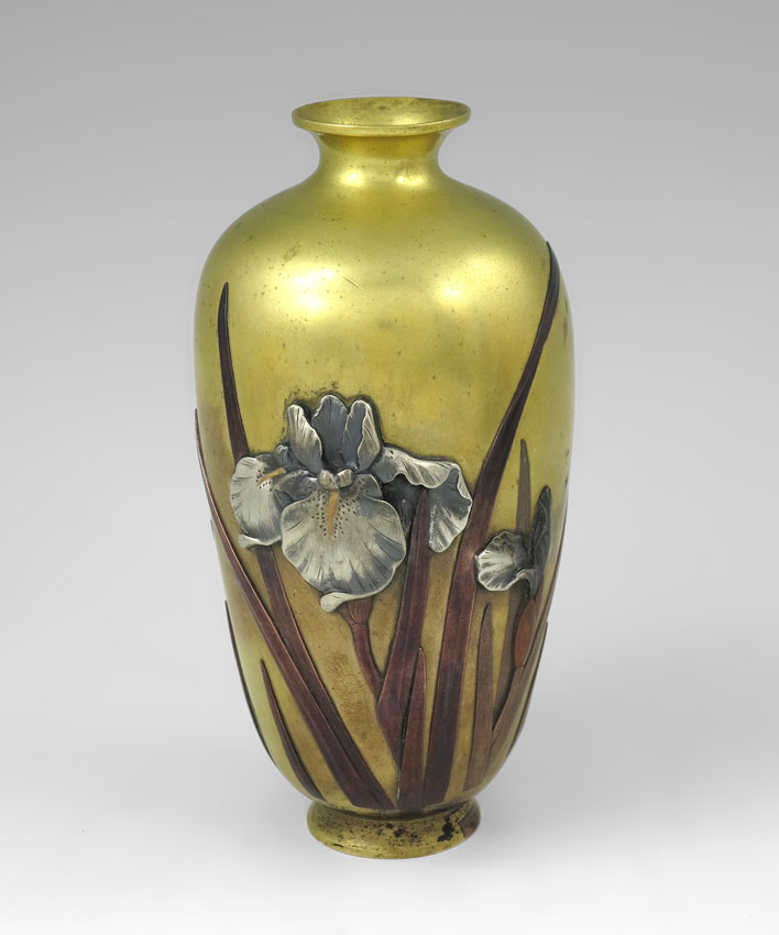 SIGNED JAPANESE MIXED METAL VASE WITH IRIS: Bronze with applied silver iris flowers and copper leaves. Signed in characters on base. 6 3/8'' h. x 3''.