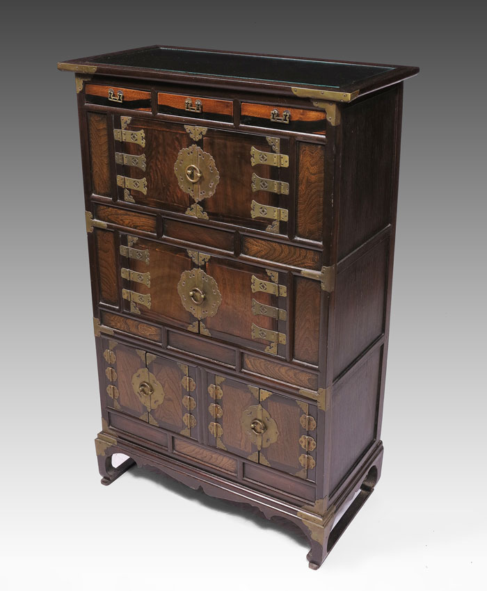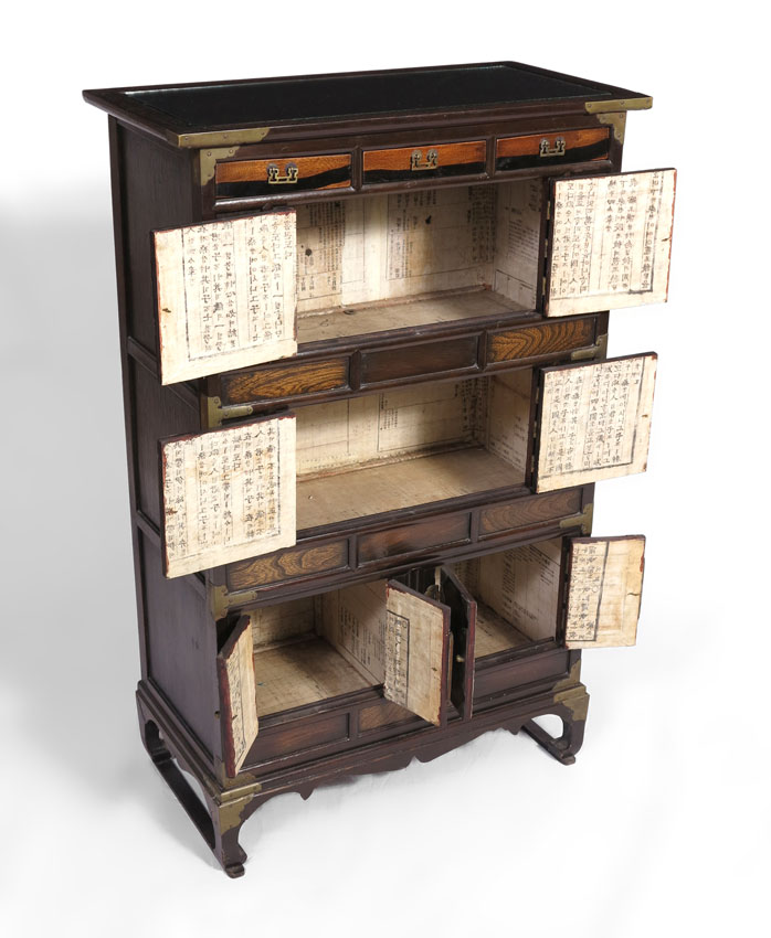 JAPANESE TONSU CABINET: A petite Japanese metal mounted storage cabinet, drawers and doors, lined with newsprint. Measures approx. 43'' tall x 27 1/2'' x 14''.