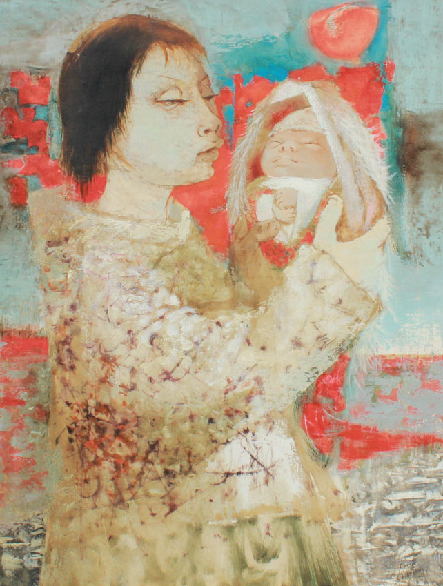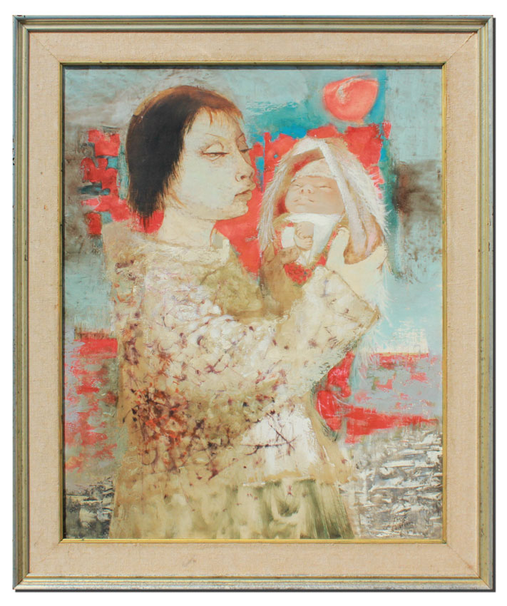 LAVARENNE, Pierre, (French, 1928- ): ''Mere Avec Son Enfant'', Oil/Canvas, 32'' x 25 1/2'', signed lower right, also signed and titled verso, period gilded frame with wear and fabric mat, 37 3/4'' x 31 1/2'', sold with Artist's Exhibition Catalog.