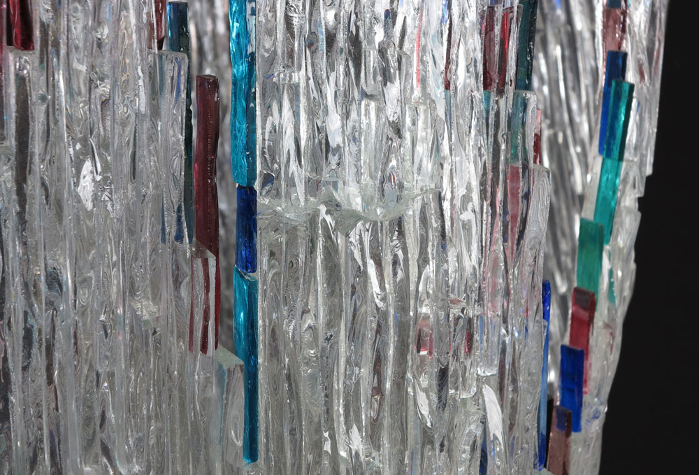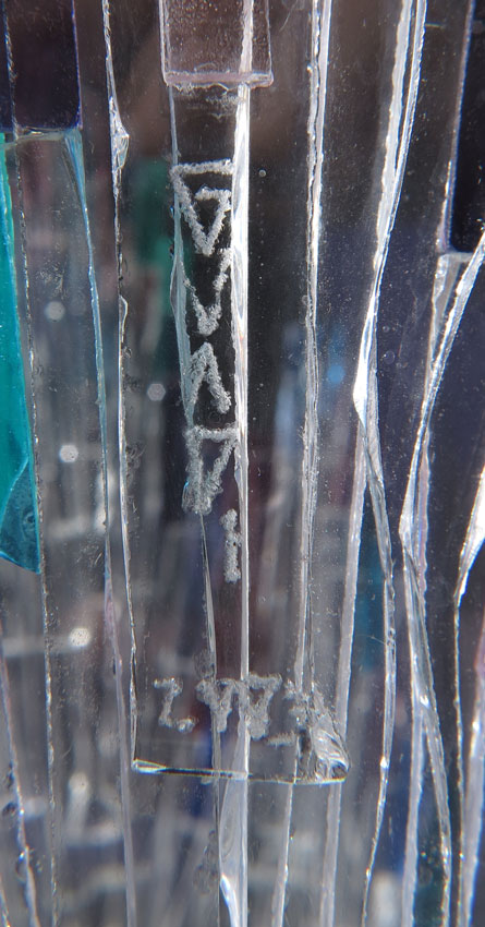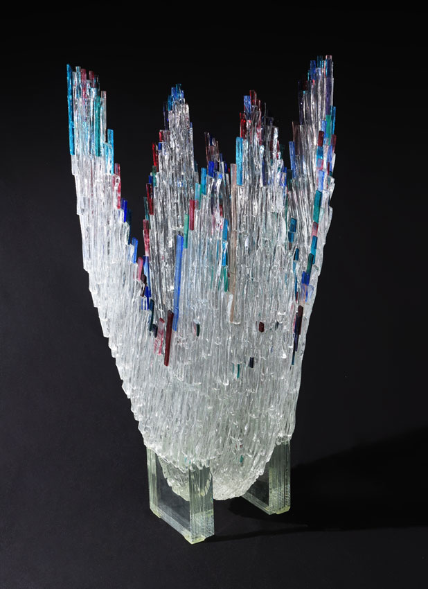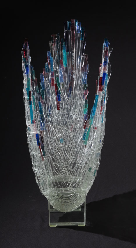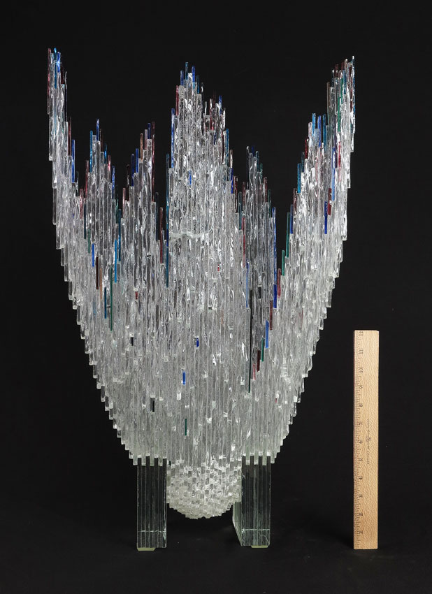 GUNDI ART GLASS SCULPTURE: Plate glass cut into small pieces, tumbled to remove sharp edges, then fused with ultra strong bonding into a faceted sculpture. Signed Gundi. Her residence and studio is in Ontario. 17 1/2'' x 17''.