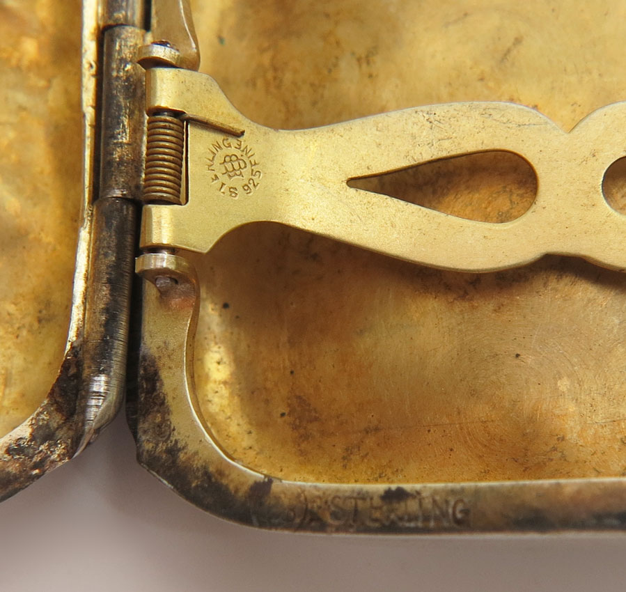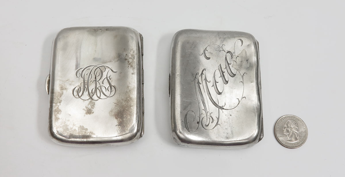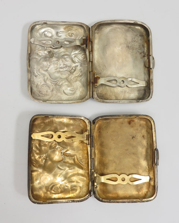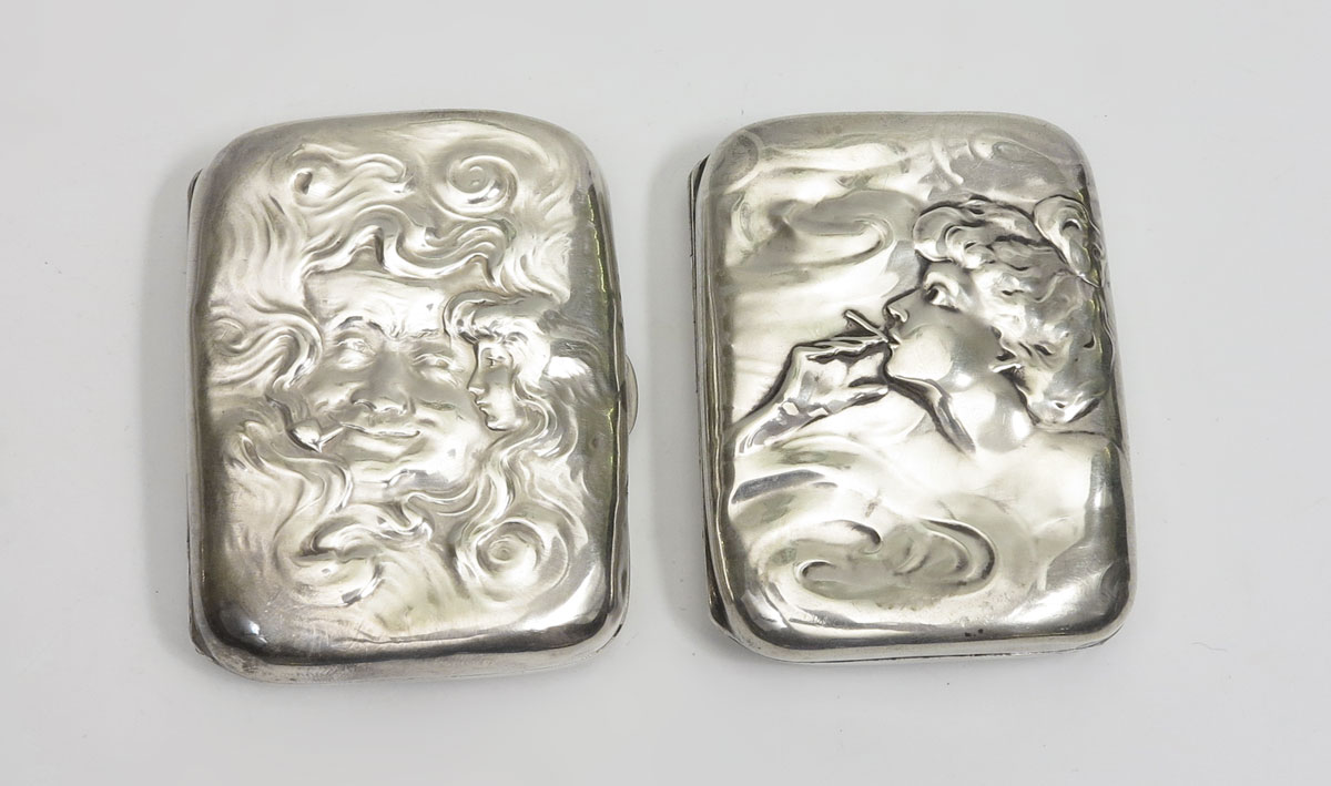 ART NOUVEAU STERLING SILVER CIGARETTE CASES: To include; 1) Smoking man (in the moon/Santa?) in the middle, woman to left, Unger Brothers, monogrammed; 2) Smoking woman, Unger Brothers, monogrammed. 5.0 Troy oz.
