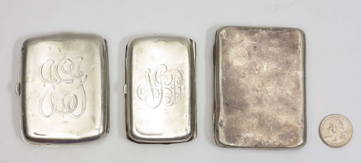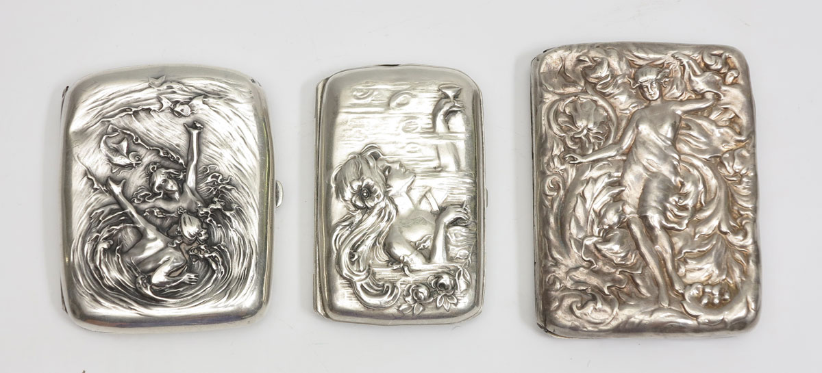 ART NOUVEAU STERLING SILVER CIGARETTE CASES: To include; 1) Woman holding up wind glass, marked sterling, monogrammed; 2) Standing woman, outstretched arms, marked sterling with illegible maker's mark. 3) 2 Women in the water amid flying fish, Kerr, monogrammed. 5.7 Troy oz.