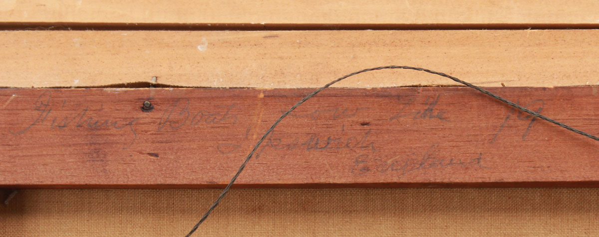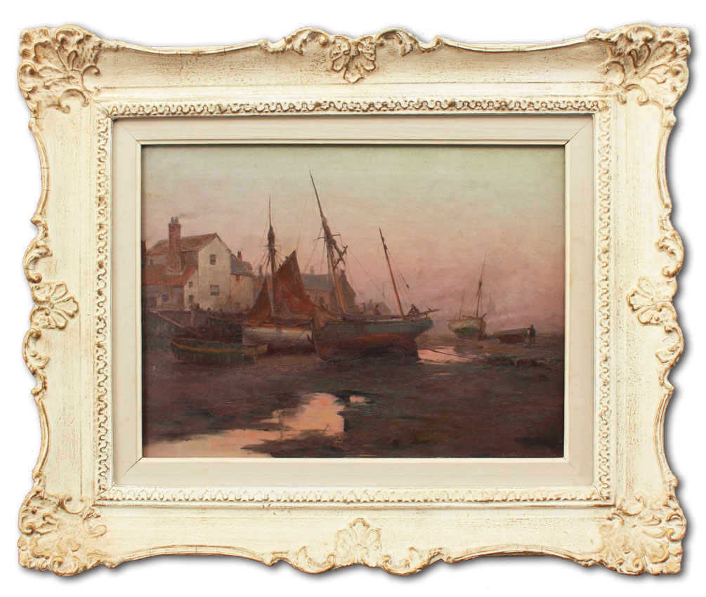 FLEMING, Alexander M., (Canadian, 1878-1929): ''Fishing Boats, Low Tide, Ipswich, England'', 12'' x 16'', signed lower right, dated 1897, encased in carved and painted frame, 19'' x 23 1/2'', titled verso in the stretcher.