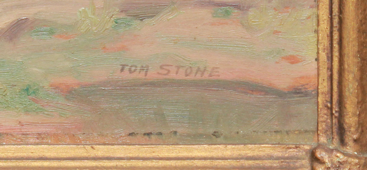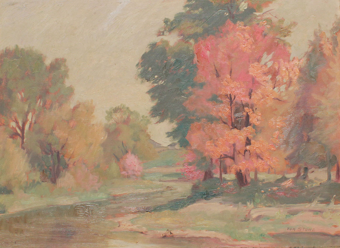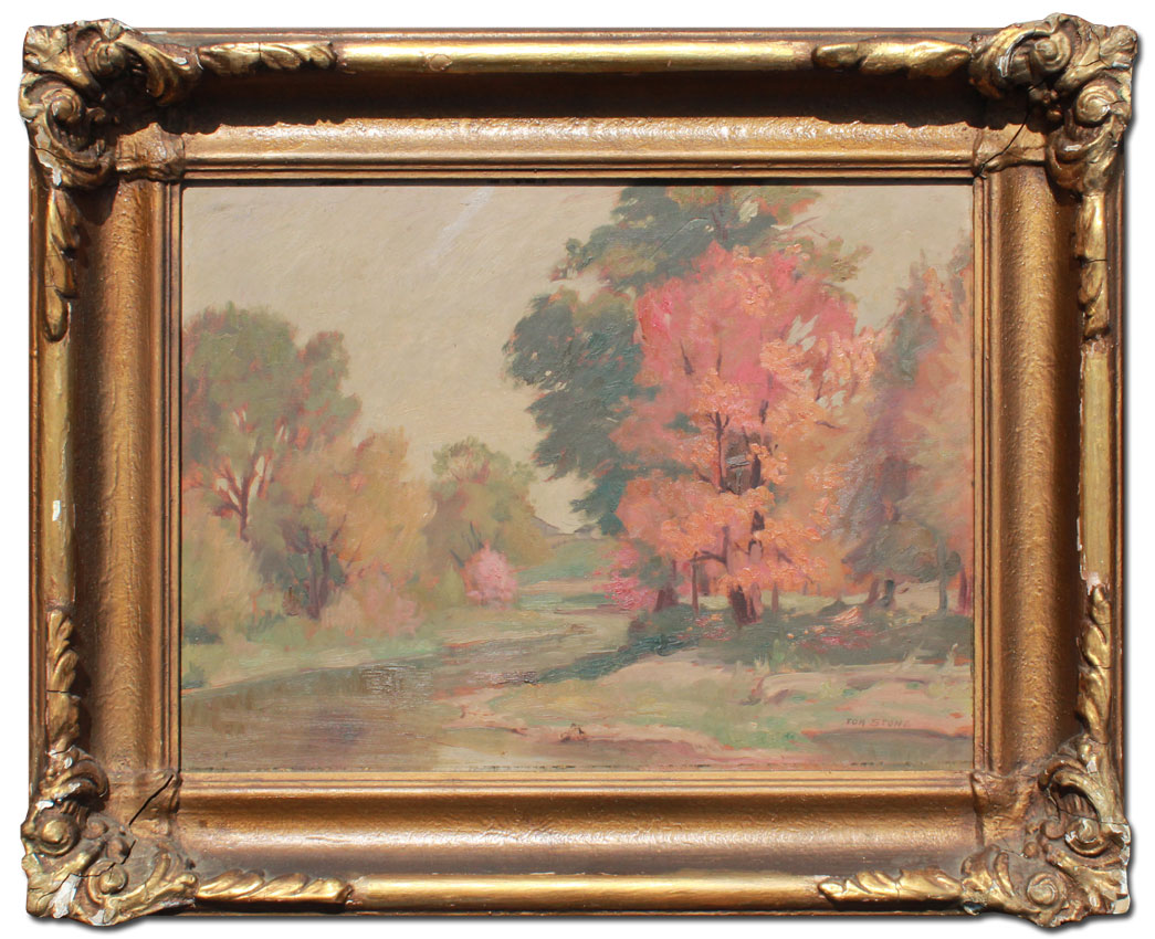 STONE, Tom (Canadian, 1894-1978): Autumnal Stream Landscape, Oil/Board, 12'' x 16'', signed lower right, encased in carved and gilded period frame with wear, 17 1/2'' x 21 1/2''.