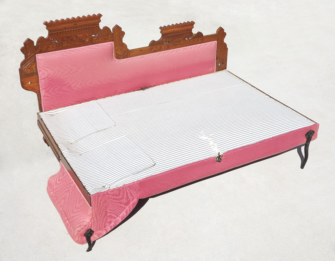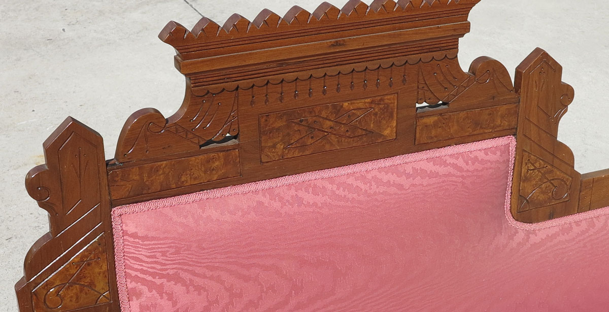 EASTLAKE VICTORIAN DAY BED/FAINTING COUCH: Incise carved burled walnut back, sloping end when closed, flips open with metal supports to double sleeping space, pink upholstery is very suitable to the style. 75''l.
