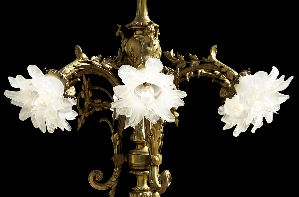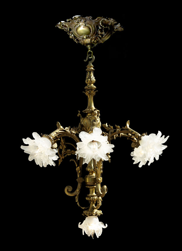 ELEGANT 6 ARM BRONZE CHANDELIER: 6 arm, 7 light with foliate motif body. Frosted glass floral motif shades. Approx. 38 3/4'' h. x 31''.