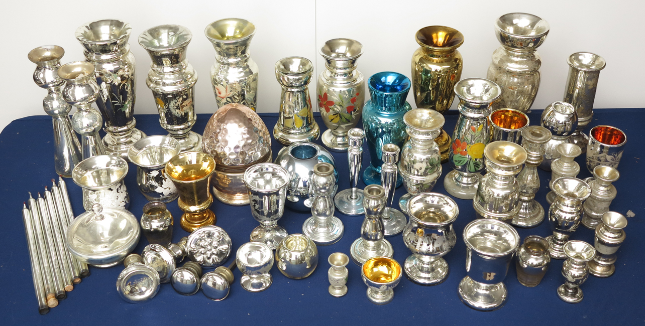 VINTAGE MERCURY GLASS: Approx. 60 pieces from a life long collection to include a rose colored egg shaped, hinged top decanter set, vases, door knobs, curtain tie backs, tall and round candle holders and candles. Some signed Czech, some blue, some gold, some with the mercury in better shape than the others. The largest is 12.5'', the smallest 3-4''.