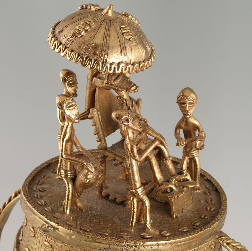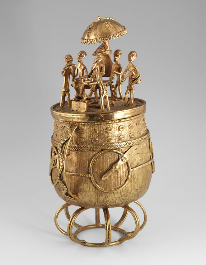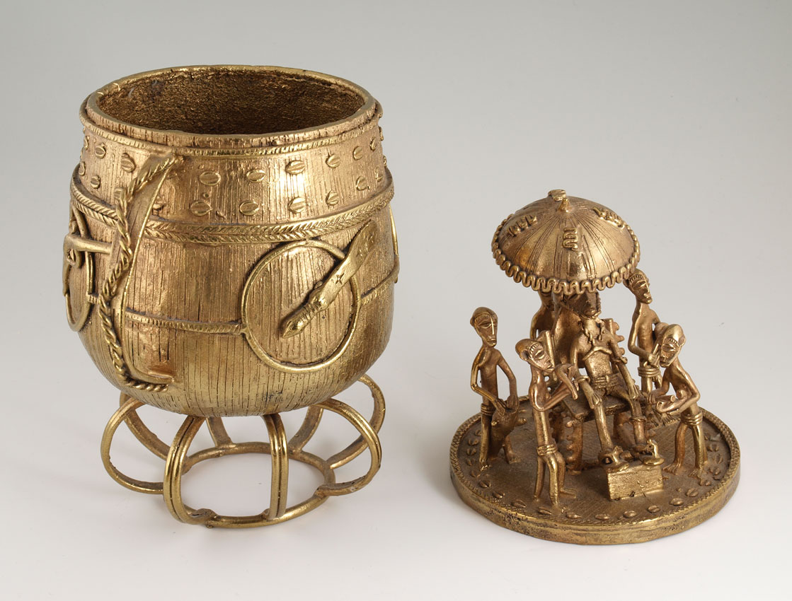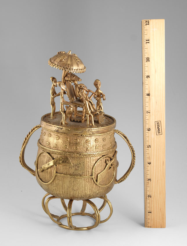AFRICAN ASANTE KUDUO VESSEL, GHANA: The Asante developed remarkably diverse kuduo containers cast of copper alloys. Kuduo were used in many ways. They held gold dust and other valuables, but could also be found in important political and ritual contexts. Some kuduo were buried with their owners, while others were kept in the palace shrine rooms that housed the ancestral stools of deceased state leaders. Life and the afterlife, the present and the past, were enhanced and made more meaningful by the presence of these elegant prestige vessels. Lidded vessal measures overall 11 1/2''h x 7'' approx.