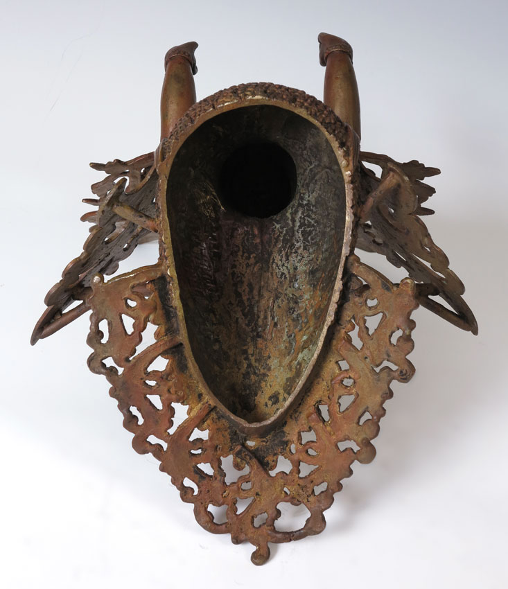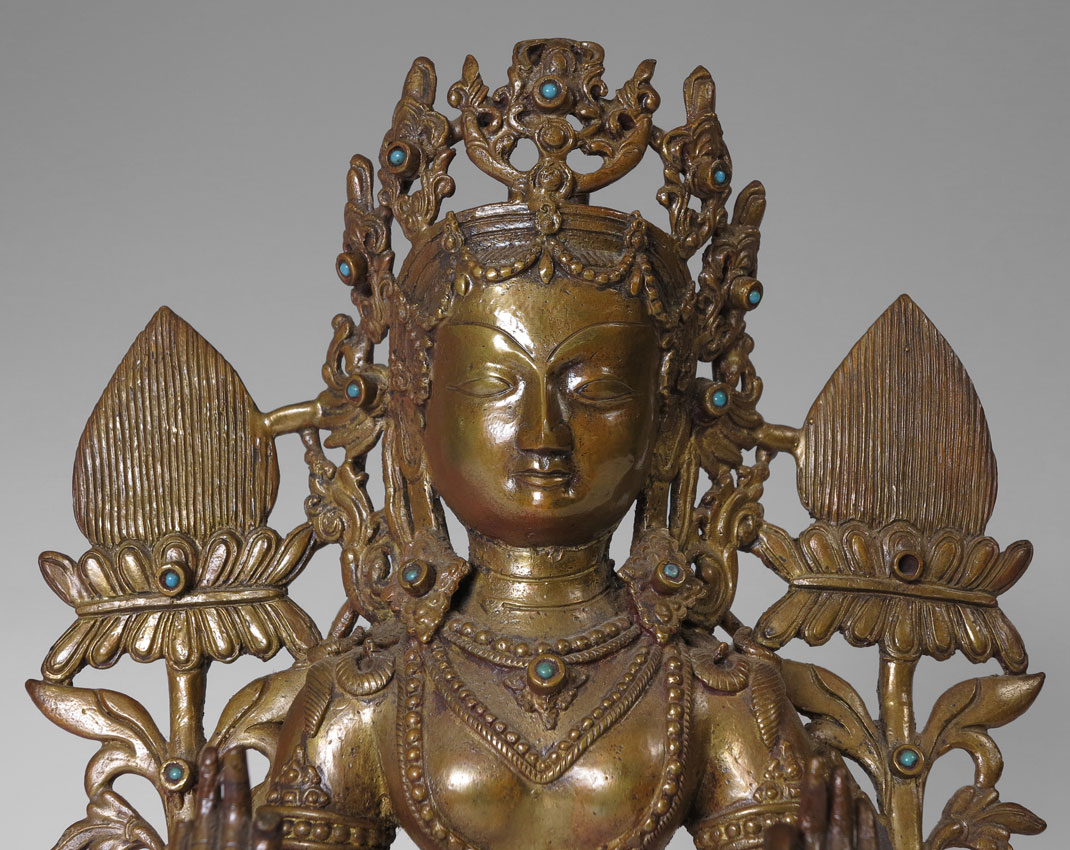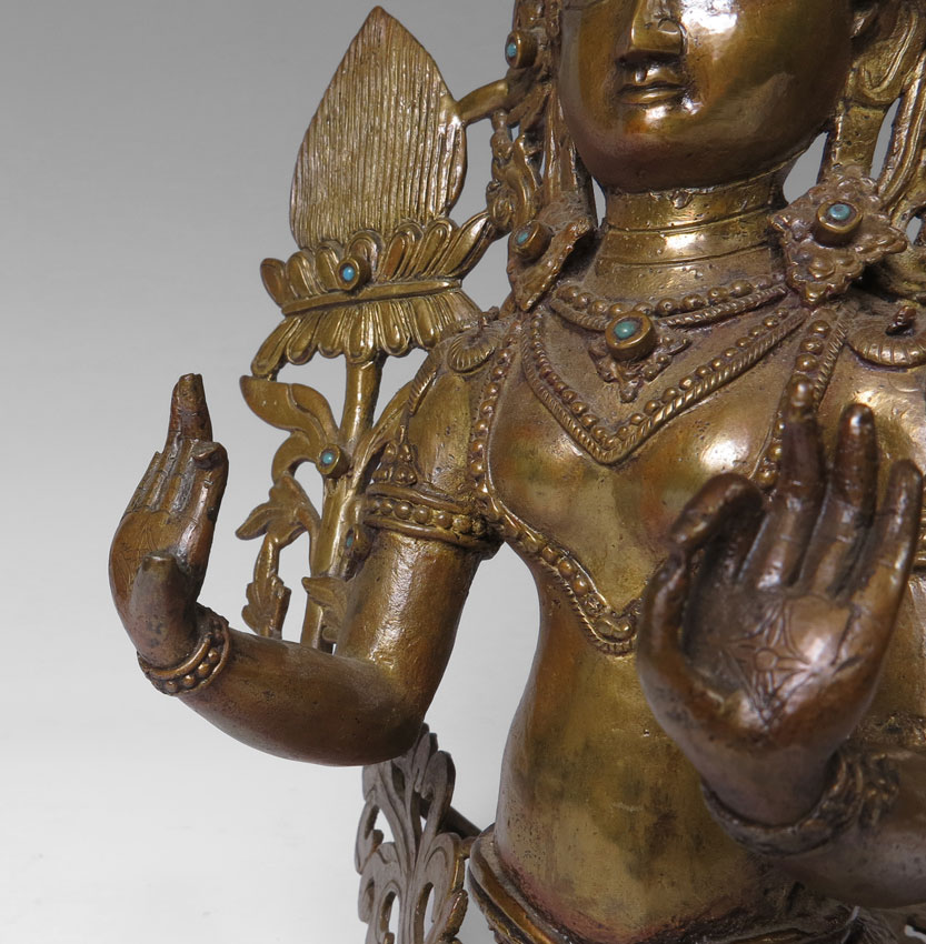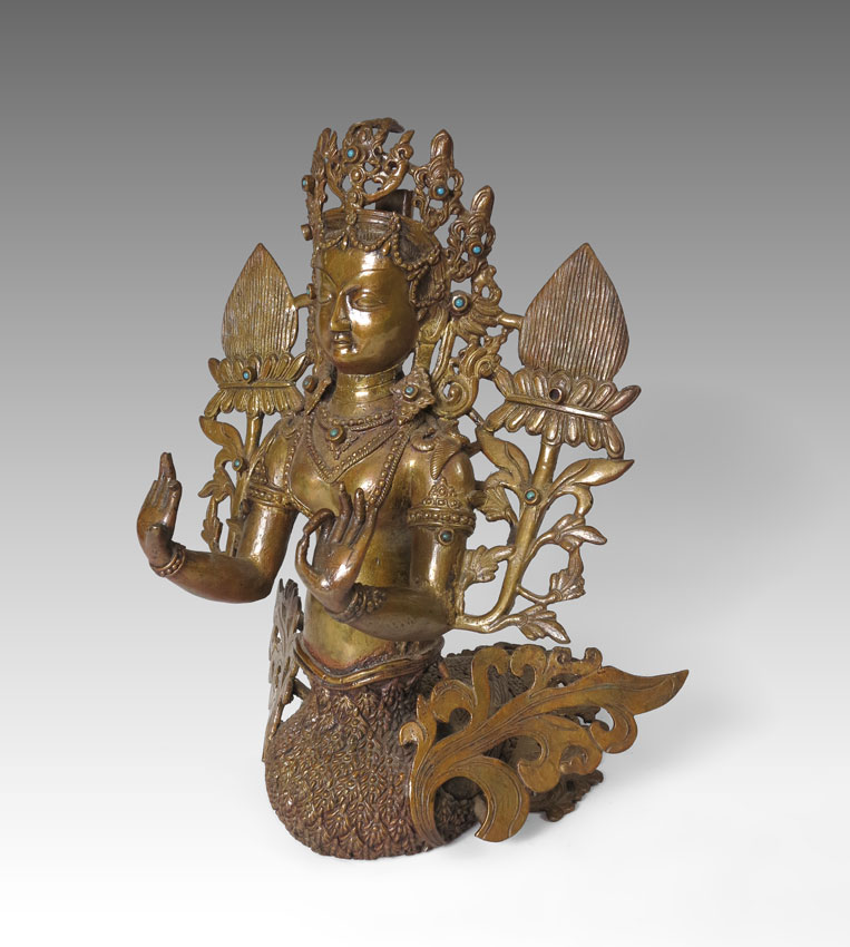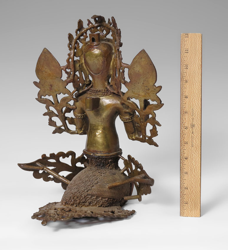 NEPALESE BRONZE HINDU GODDESS FIGURE: With inset blue stone cabochons. Measures 13 3/4'' h. x 10 1/2'' x 13''. Age unknown.