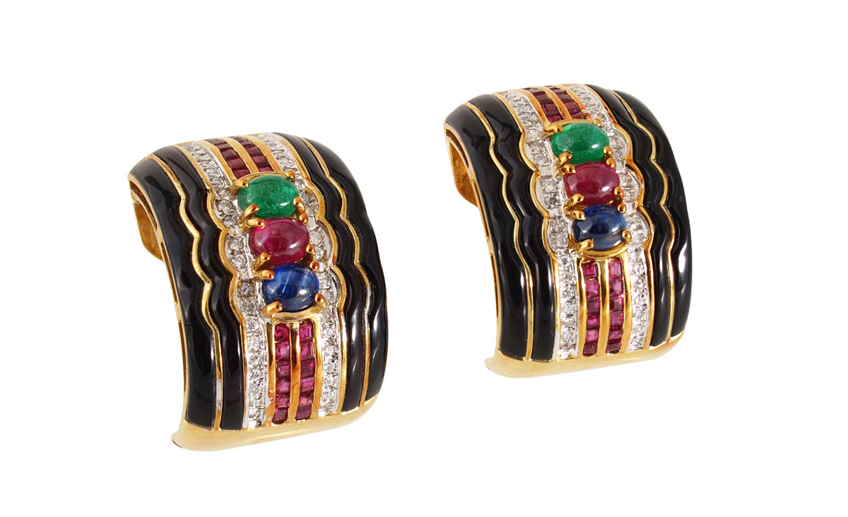 18K DIAMOND & GEMSTONE EARRINGS: 18K yellow gold earrings contain 76 round full cut diamonds totaL approx. .50 Ct. The diamonds average VS in clarity and G-H in color. 48 square calibre cut rubies and 6 oval cabochon cut rubies, emeralds and sapphires. Gemstone weight: 5.00 Ct. Approx. 4 pieces of black onyx. Post and hinged clip closures. The diamond and gemstones are prong, channel and bead set. Post and hinged clip closures. Weight: 25.4 grams.